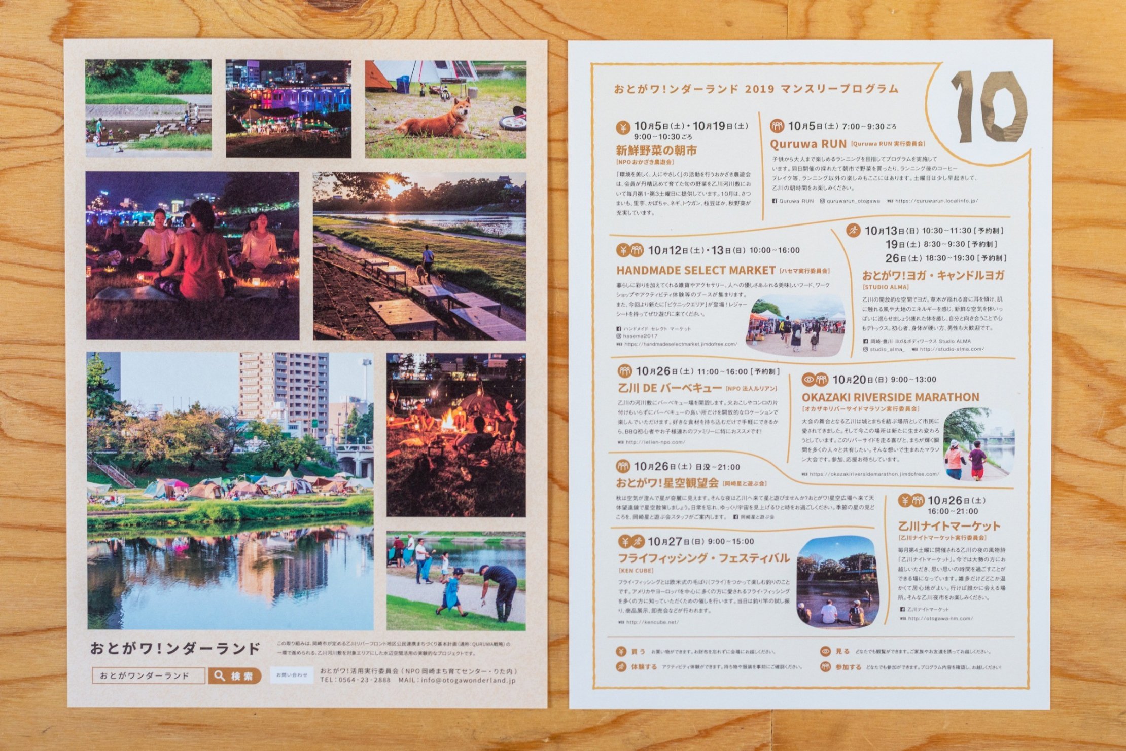 10月の表面の写真は、りぶら西の伊賀川の川遊びの様子、HOMETOWNとライトアップされた殿橋、キャンプに来ていたワンちゃん、おとがワ!キャンドルヨガ、乙川の夕日、朝のキャンプサイトの様子と焚き火を囲んだキャンプの様子、子どもたちと一緒に行ったリバークリーンです。