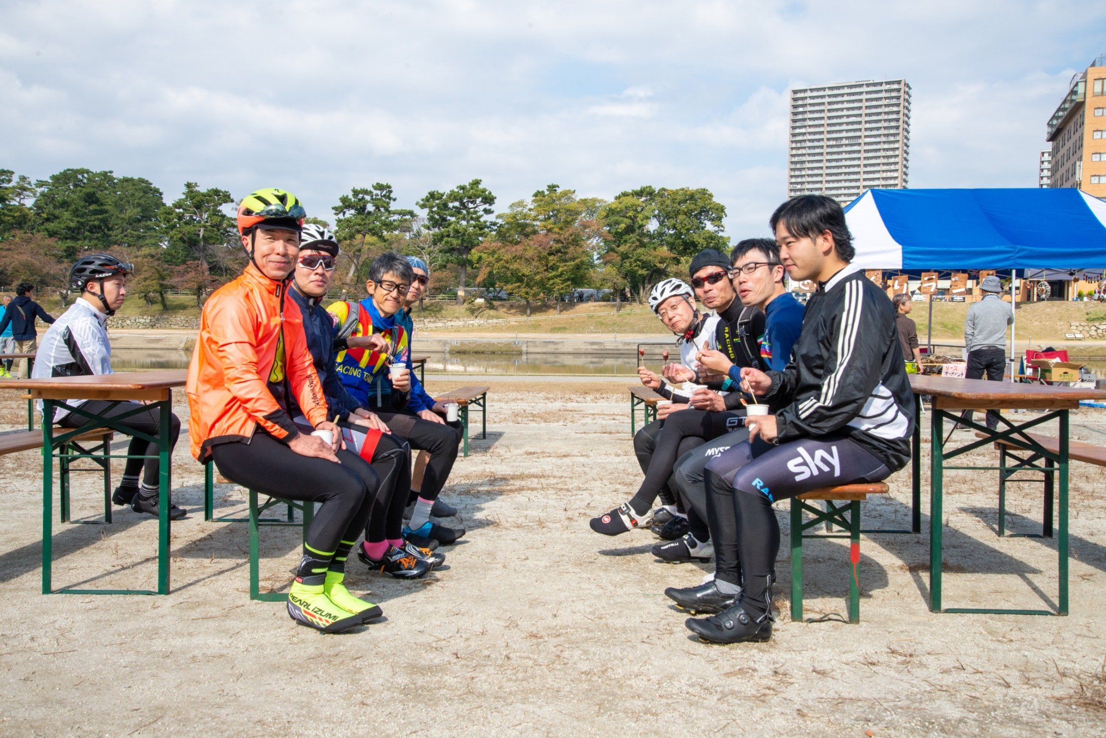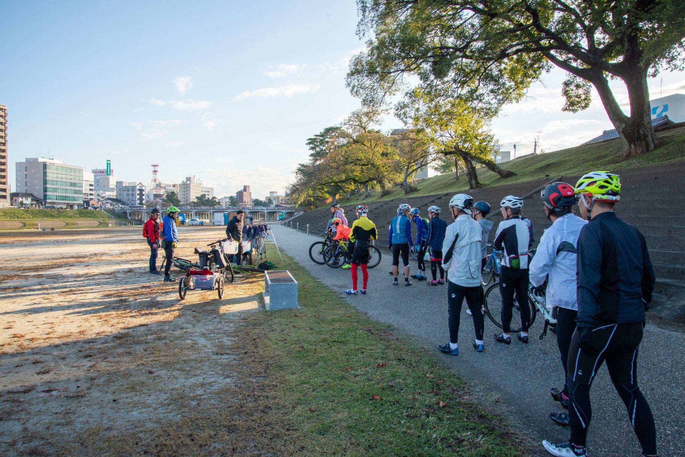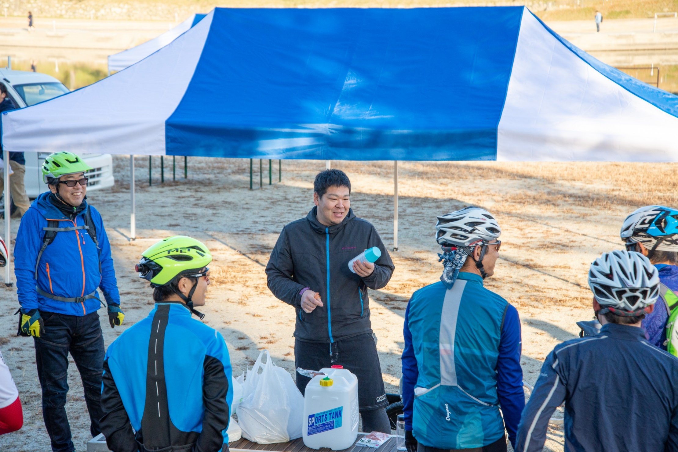 おとがワ!ンダーランド2019のオータムイベント『川ぐらし』。サイクルぴっとイノウエさんによる、『流域サイクリング –延命水を汲みに行こう!-』からプログラムはスタートしました。味噌汁やドラム缶風呂に使われるお水を自転車チームが汲みに行ってくれました。