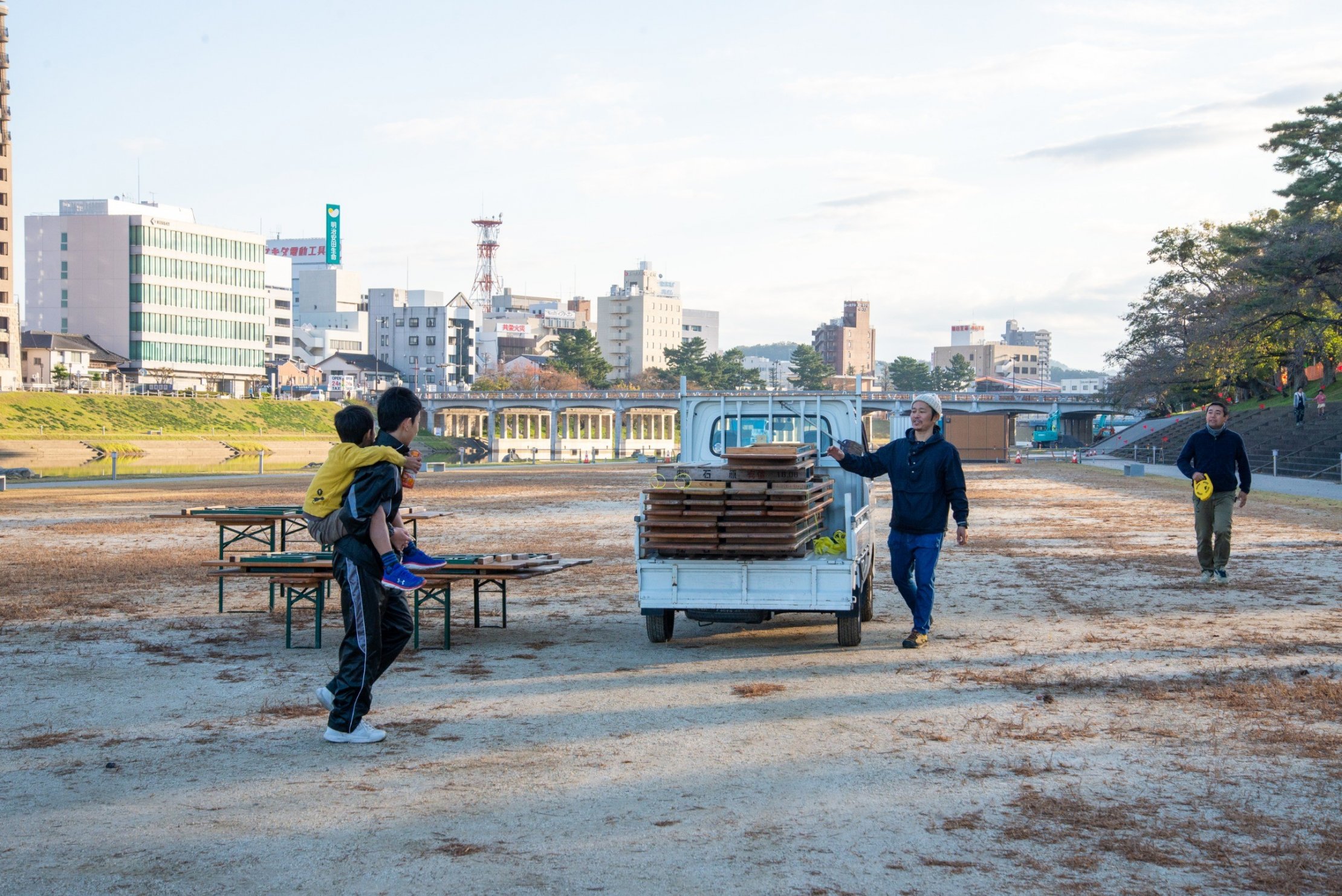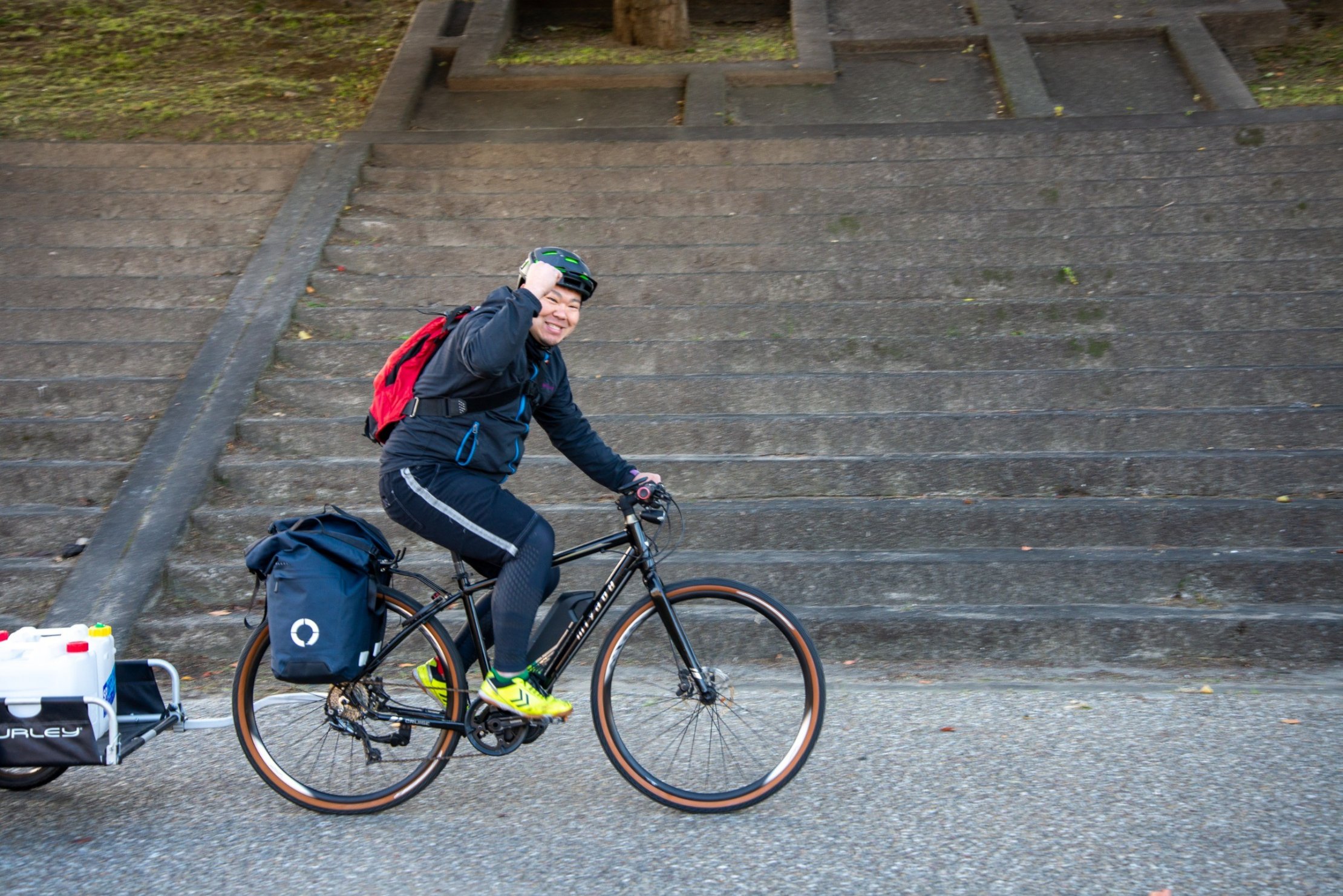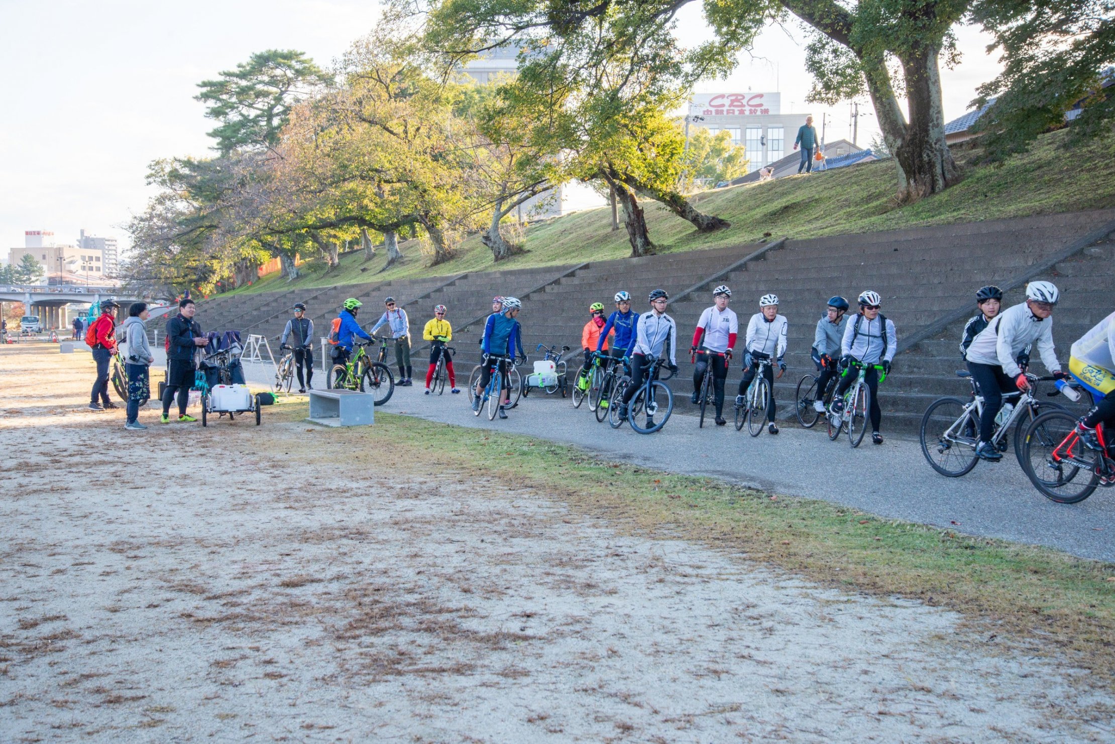おとがワ!ンダーランド2019のオータムイベント『川ぐらし』。サイクルぴっとイノウエさんによる、『流域サイクリング –延命水を汲みに行こう!-』からプログラムはスタートしました。味噌汁やドラム缶風呂に使われるお水を自転車チームが汲みに行ってくれました。