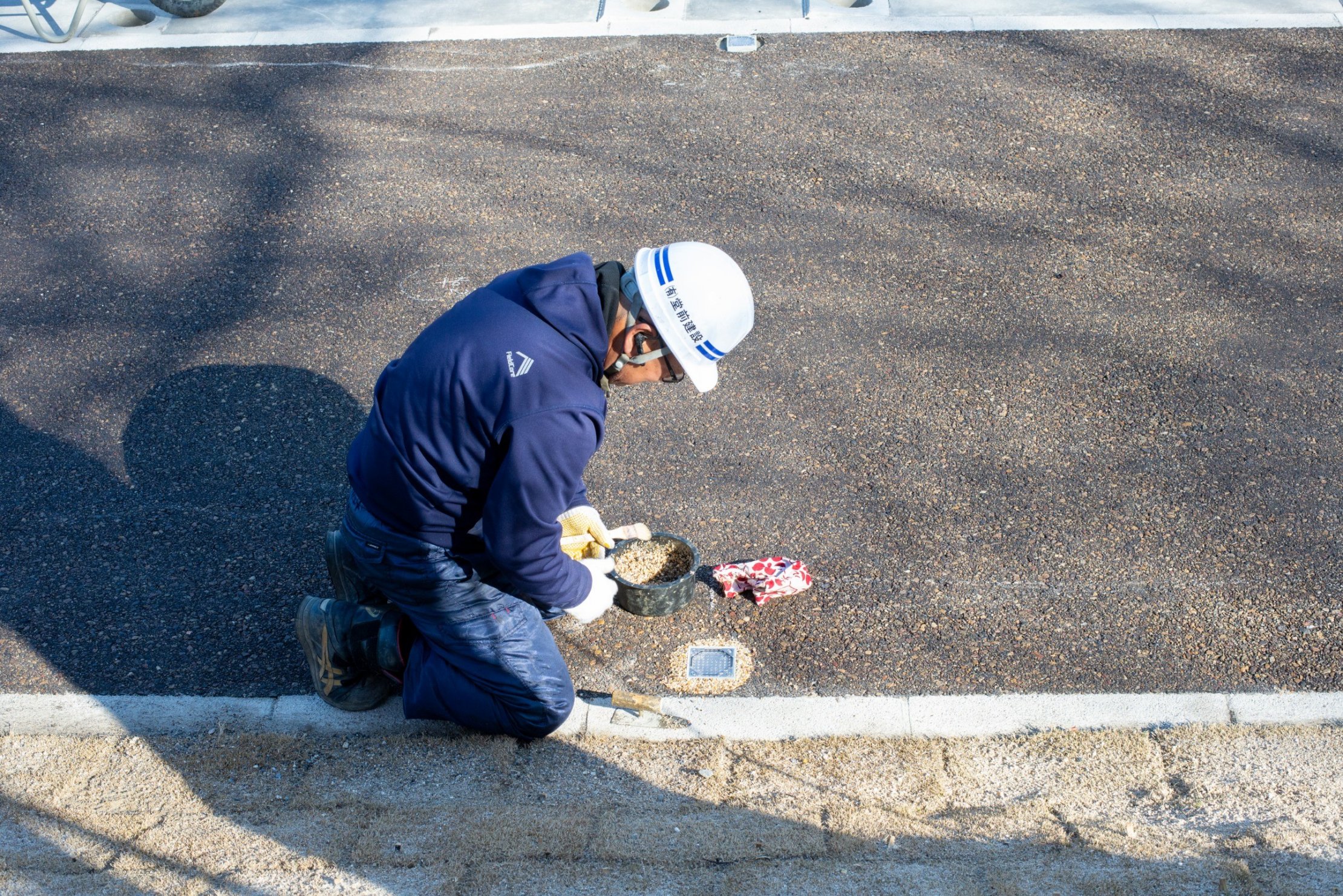 乙川河川敷へ降りていく現在工事をしているスロープで、照明を埋め込む作業が行われていました。スロープの舗装されたところは工事をしたばかりで黒々としていますが、月日がたつと照明の周りに埋めている石の色と馴染んでくるそうです。スロープを作るにもこんなにも細かな作業がされているんですね。