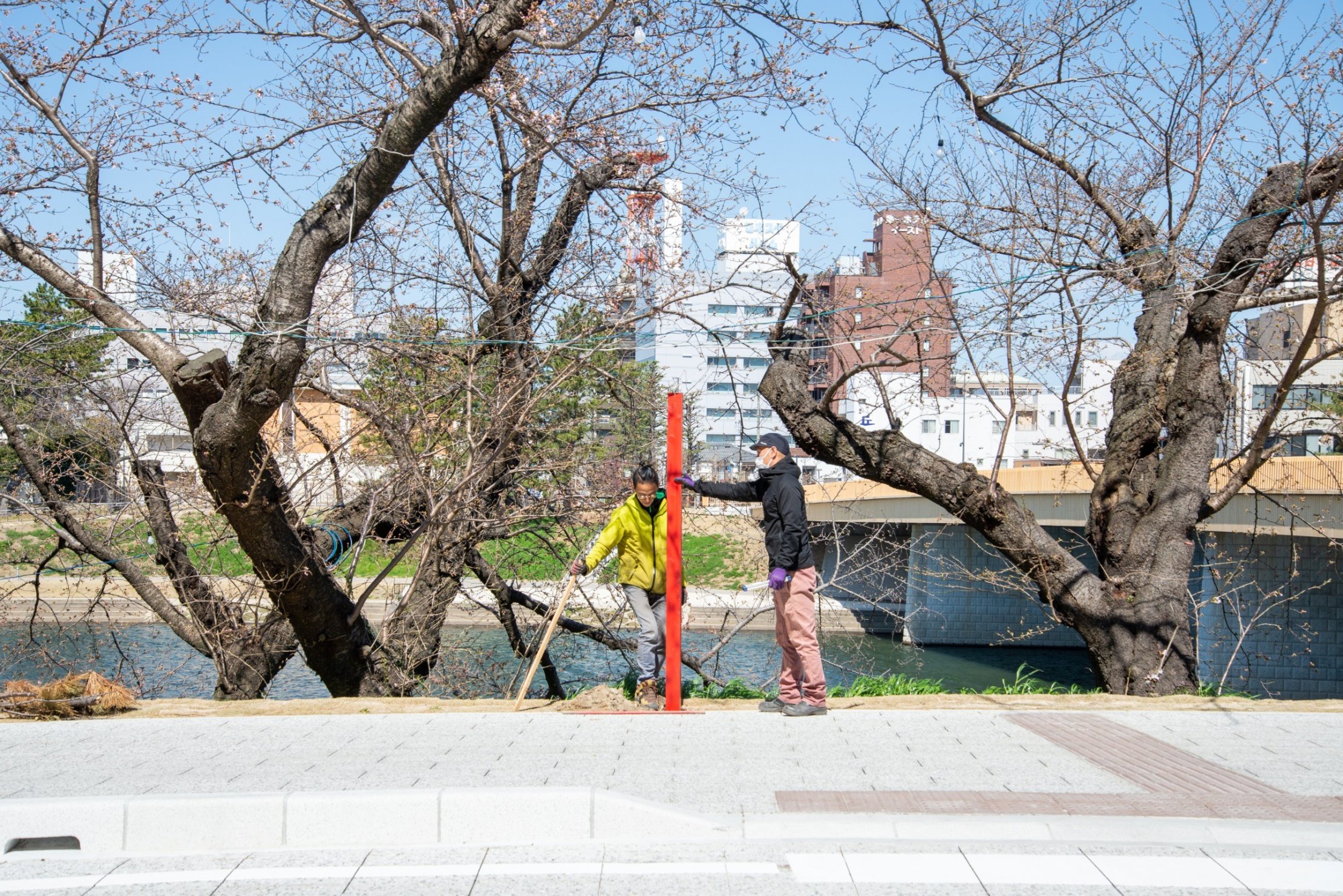 乙川沿いで奏林舎の唐澤さんたちによる「ぼんぼり」を設置する作業が行われていました。このぼんぼりは、昨年、あたまの部分が額田産材で作られ、今年は柱が額田産材で作られたそうです。まちなかに地元の木材が使われることで、山との繋がりを感じることができる取り組みだと思います。