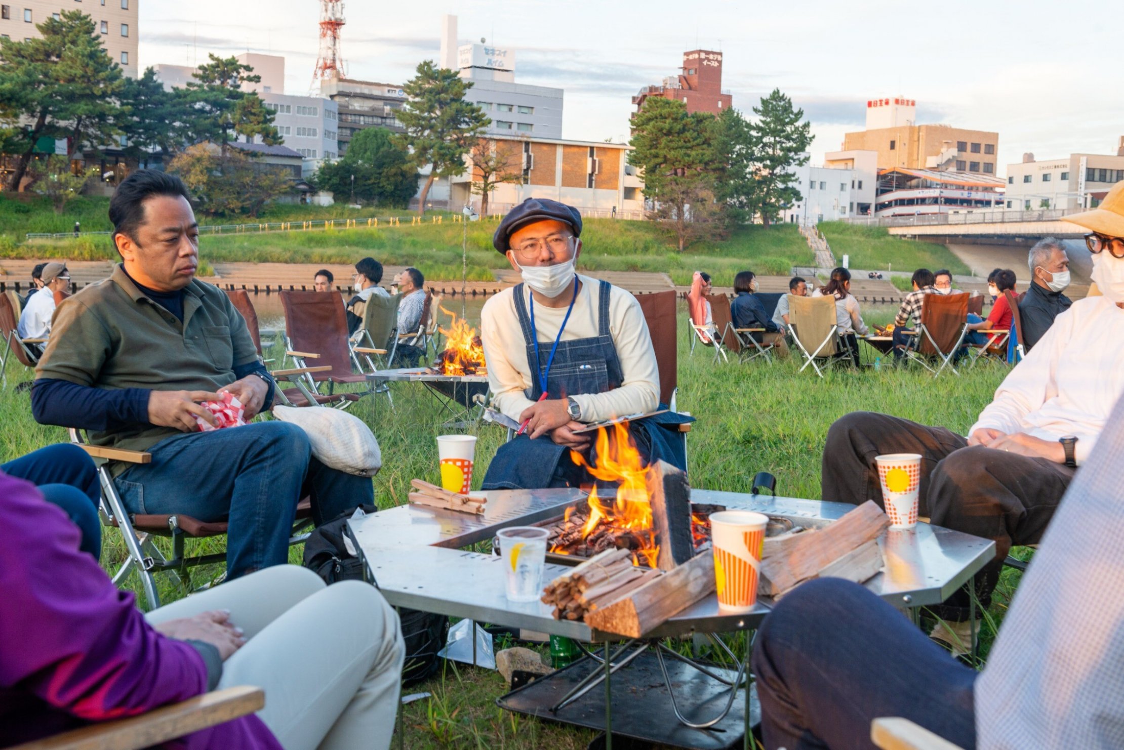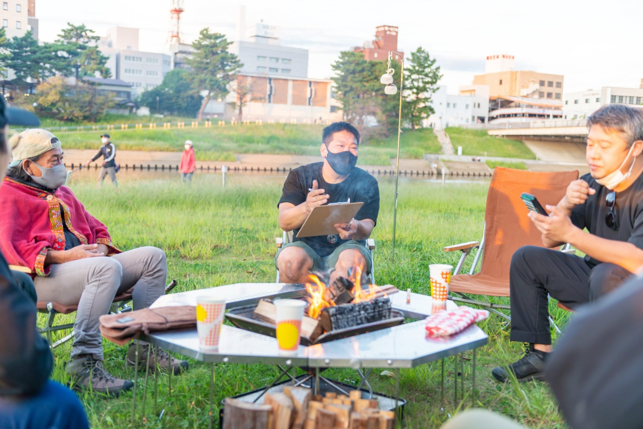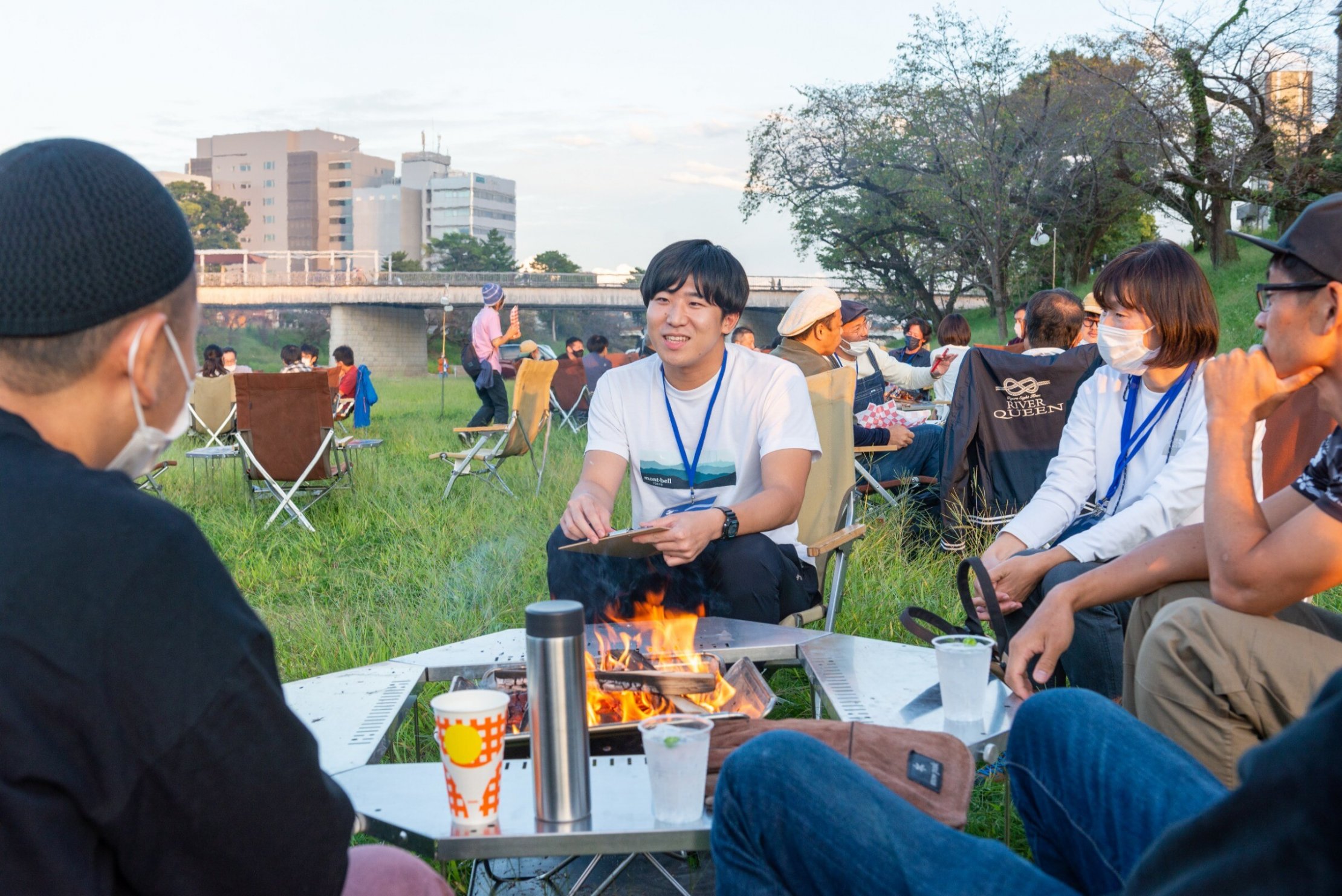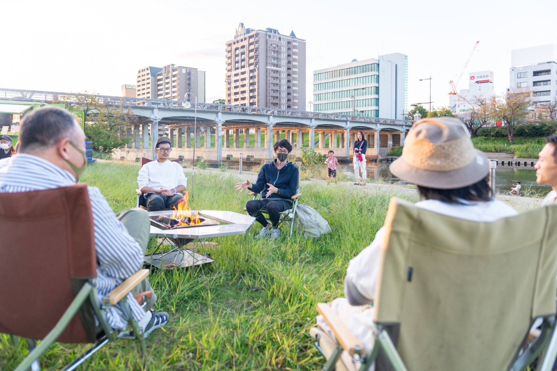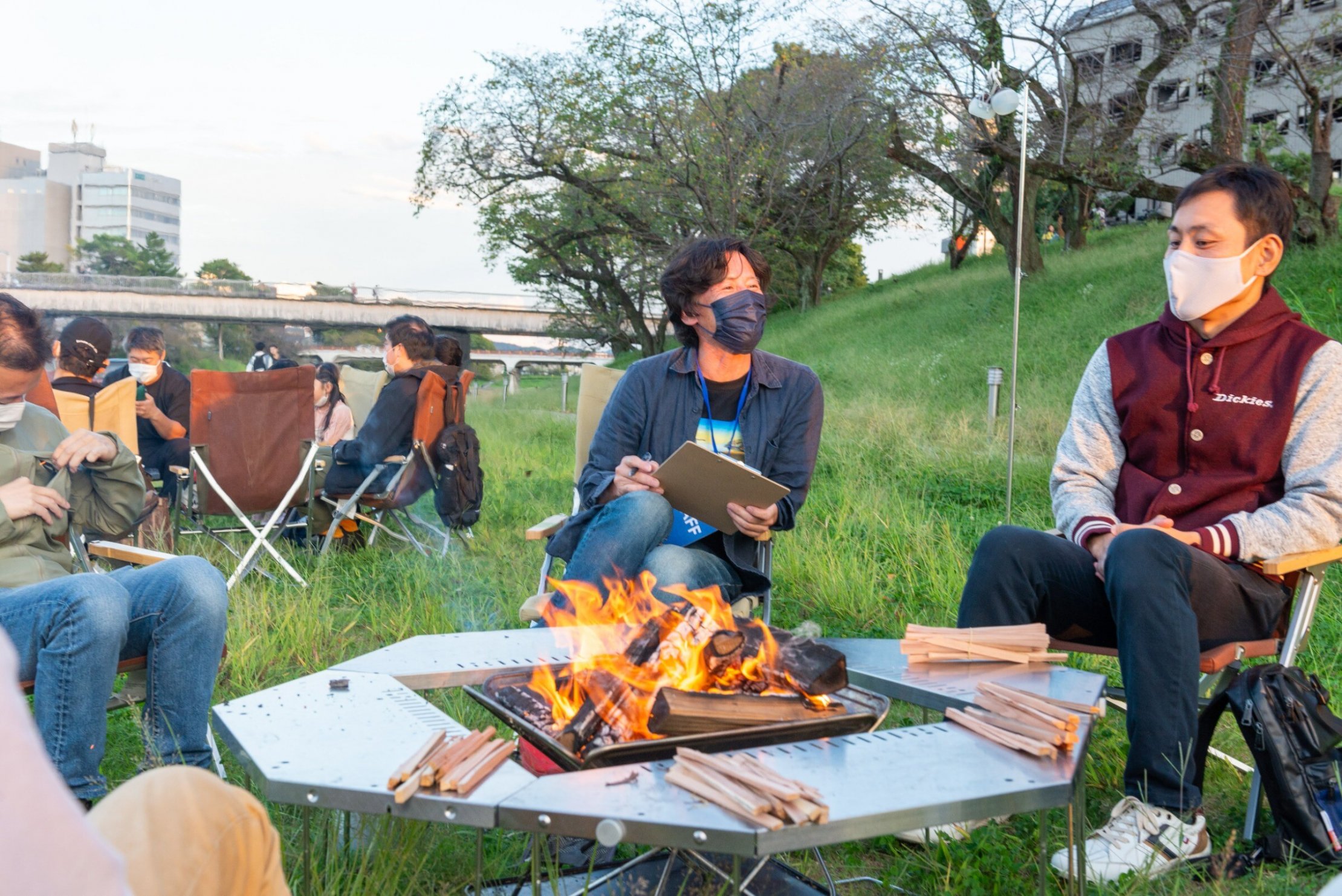 川ぐらし焚火交流会。はじめての試みです。「川と○○」というテーマで話し合います。協力は、株式会社スノーピークビジネスソリューションズさんです。