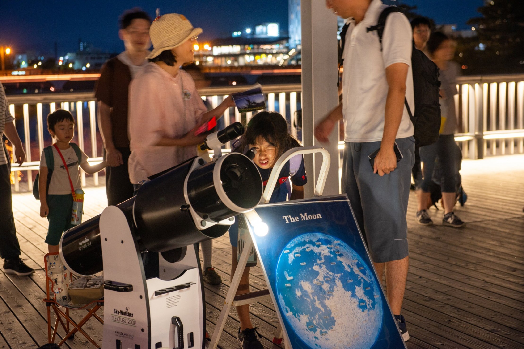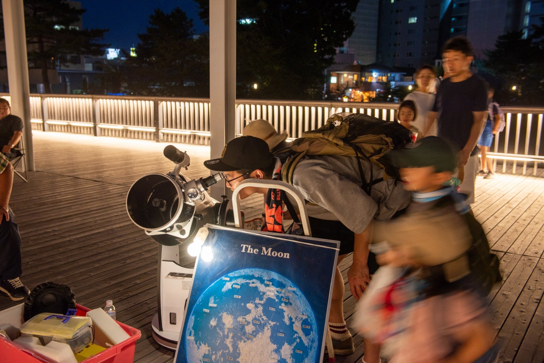 大きな天体望遠鏡を覗きます。月の表情が見えるかな?