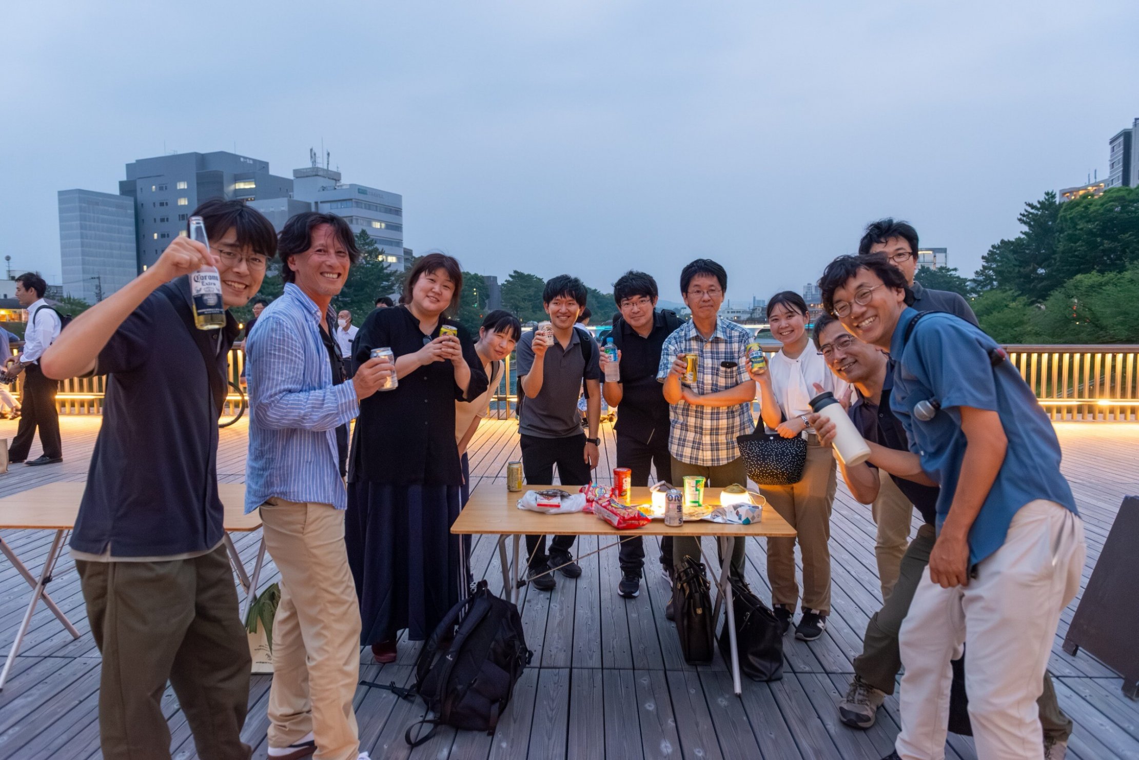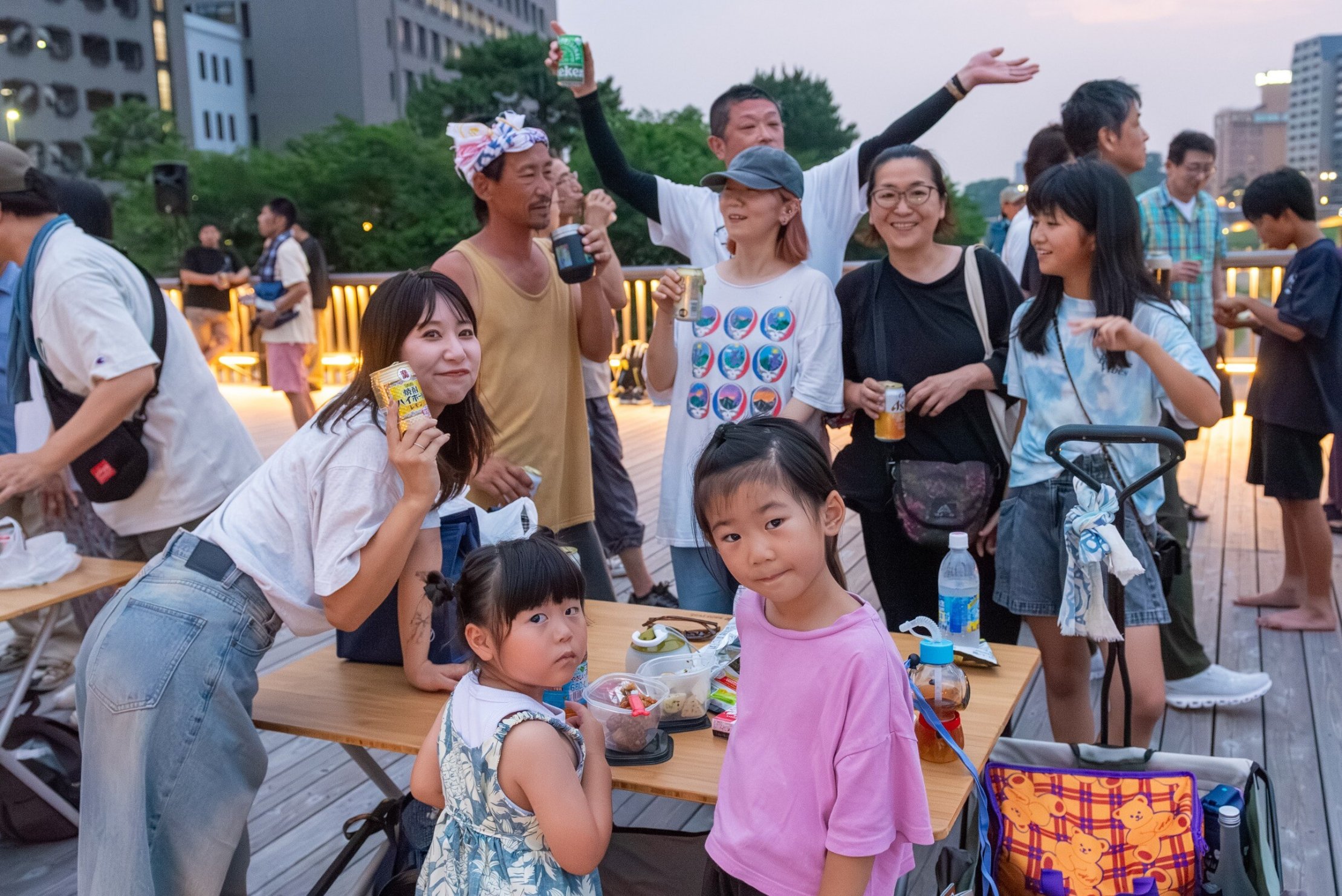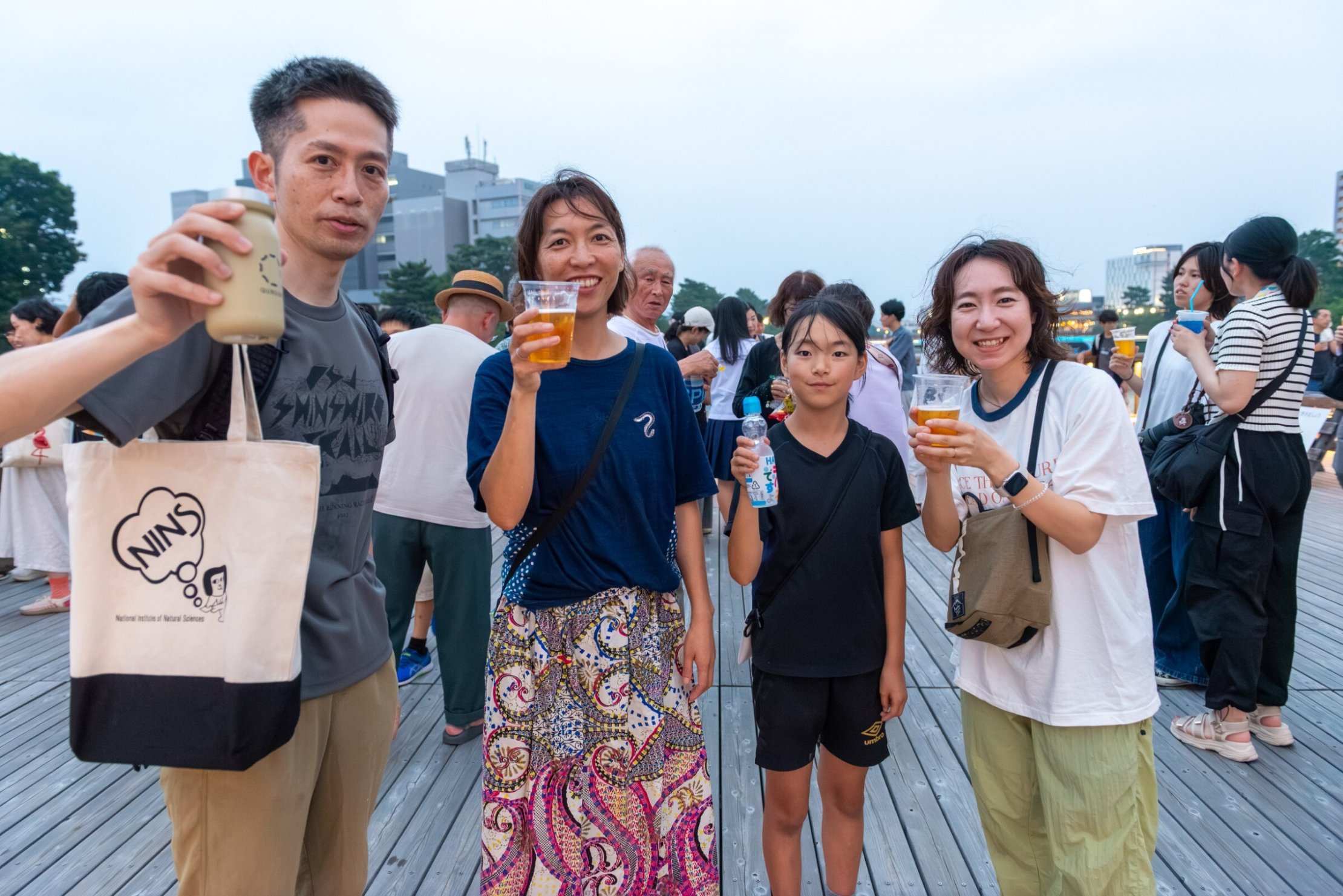 今年も水辺で乾杯には平日にも関わらずたくさんの方にお越しいただきました。令和7年7月7日と7がつく日だったこともあり、名前が7文字の方に乾杯の発声をお願いしました。この場所でいつも会える人たち、挨拶できると心がほっとします。(山田)