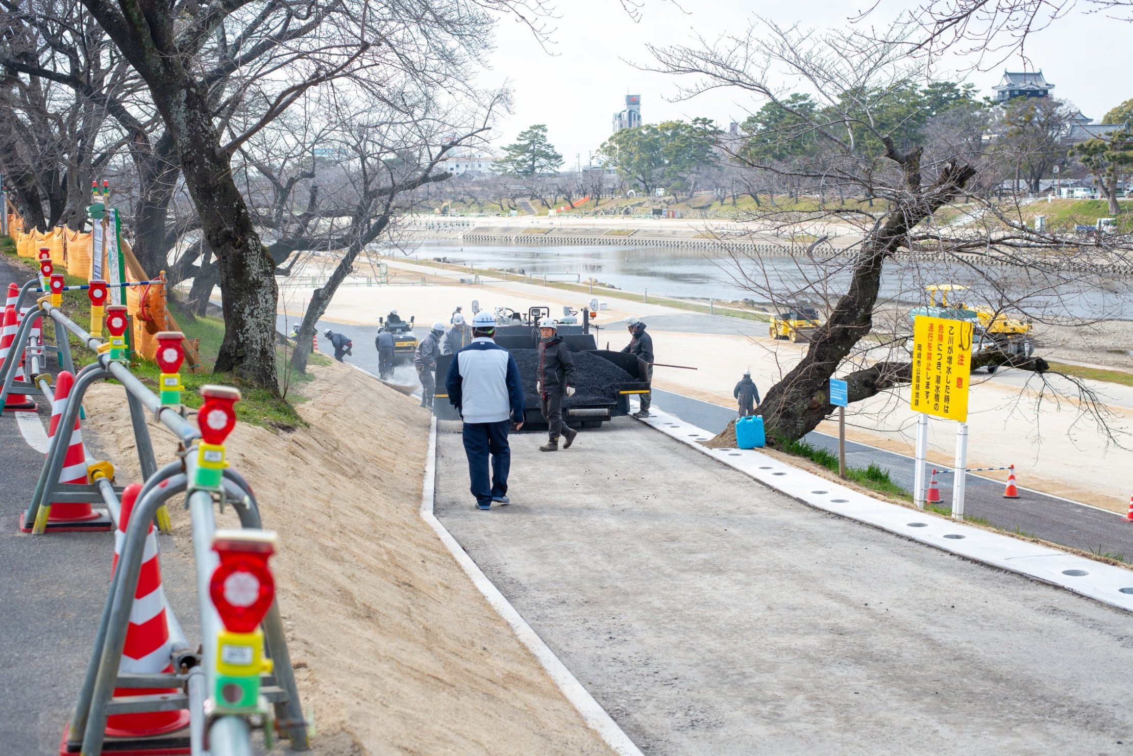 乙川河川敷へ降りていく現在工事をしているスロープで、照明を埋め込む作業が行われていました。スロープの舗装されたところは工事をしたばかりで黒々としていますが、月日がたつと照明の周りに埋めている石の色と馴染んでくるそうです。スロープを作るにもこんなにも細かな作業がされているんですね。