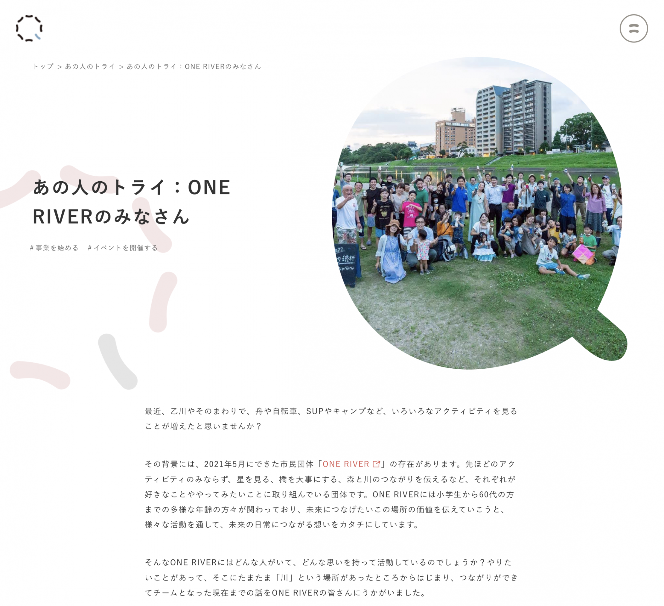 岡崎市が運営するQURUWAウェブサイト内の「あの人のTRY」コーナーにてONE RIVERが紹介されました。ONEVRIVERのこれまでの歩みや、これから目指していることなどを、ONE RIVERに関わるメンバーの言葉を紹介しながらまとめてくださっています。