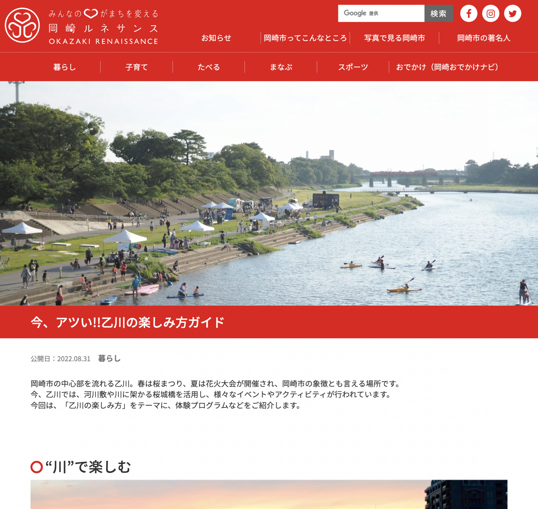岡崎市が運営するシティプロモーションサイト「岡崎ルネサンス」の記事「今、アツい!!乙川の楽しみ方ガイド」にてONE RIVERの取り組みやパートナープログラムである「Let it camp」や「おとがわリバークリーン」「桜城橋ふき」「おとがわサンデーヨガ」が紹介されています。