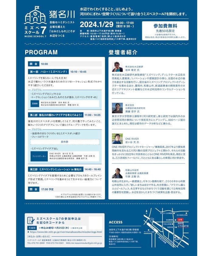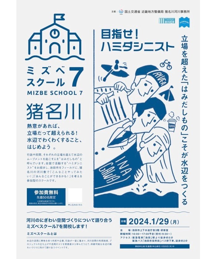 1月29日(月)に国土交通省近畿地方整備局猪名川河川事務所が主催して行う「ミズベスクール7 -目指せ!ハミダシニスト-」にONE RIVERの岩ヶ谷が登壇します。