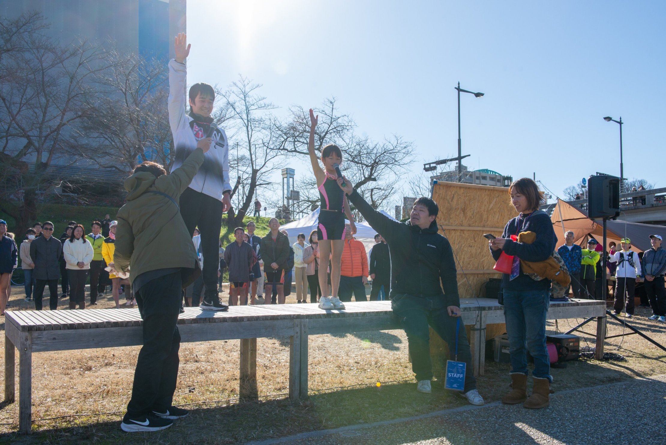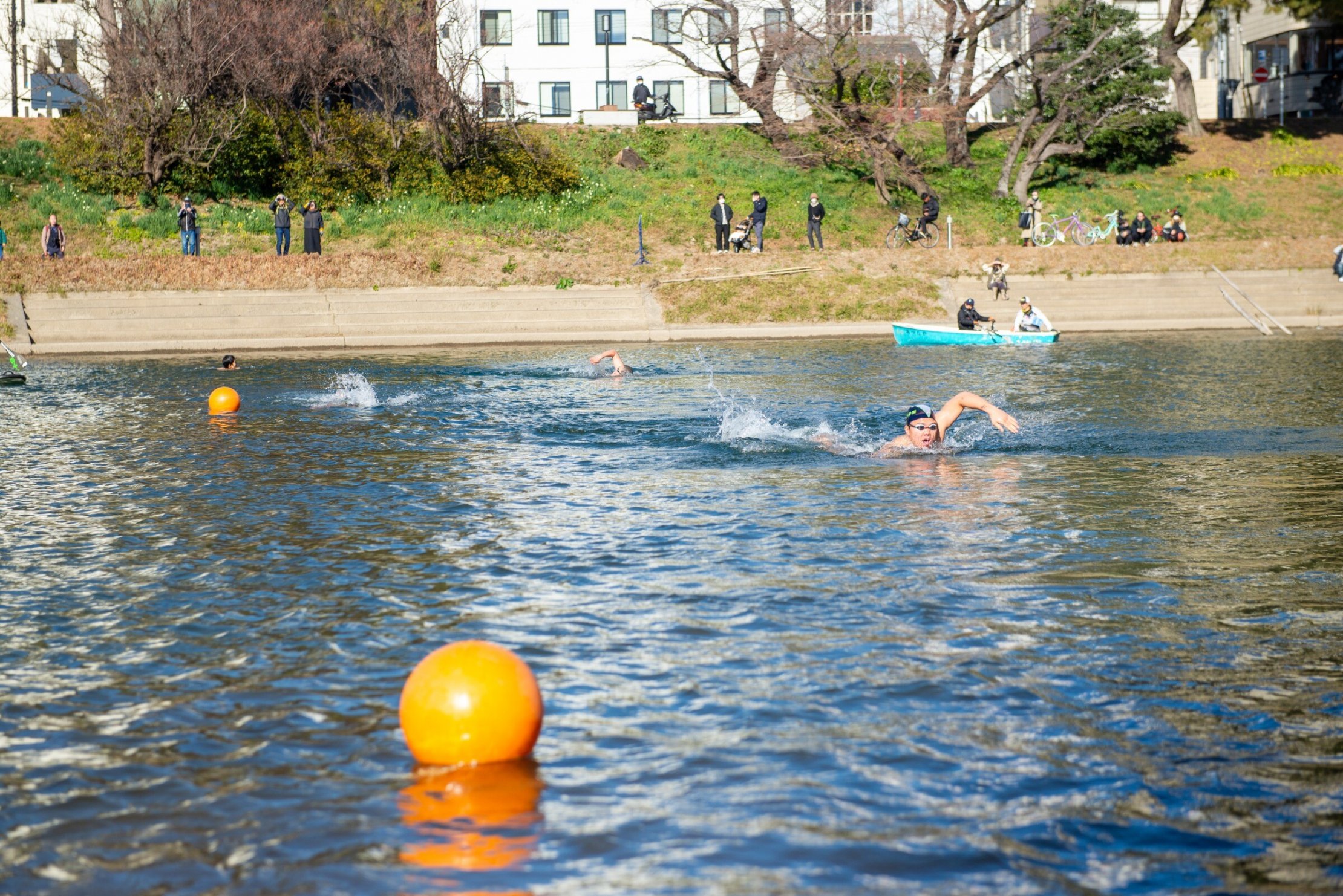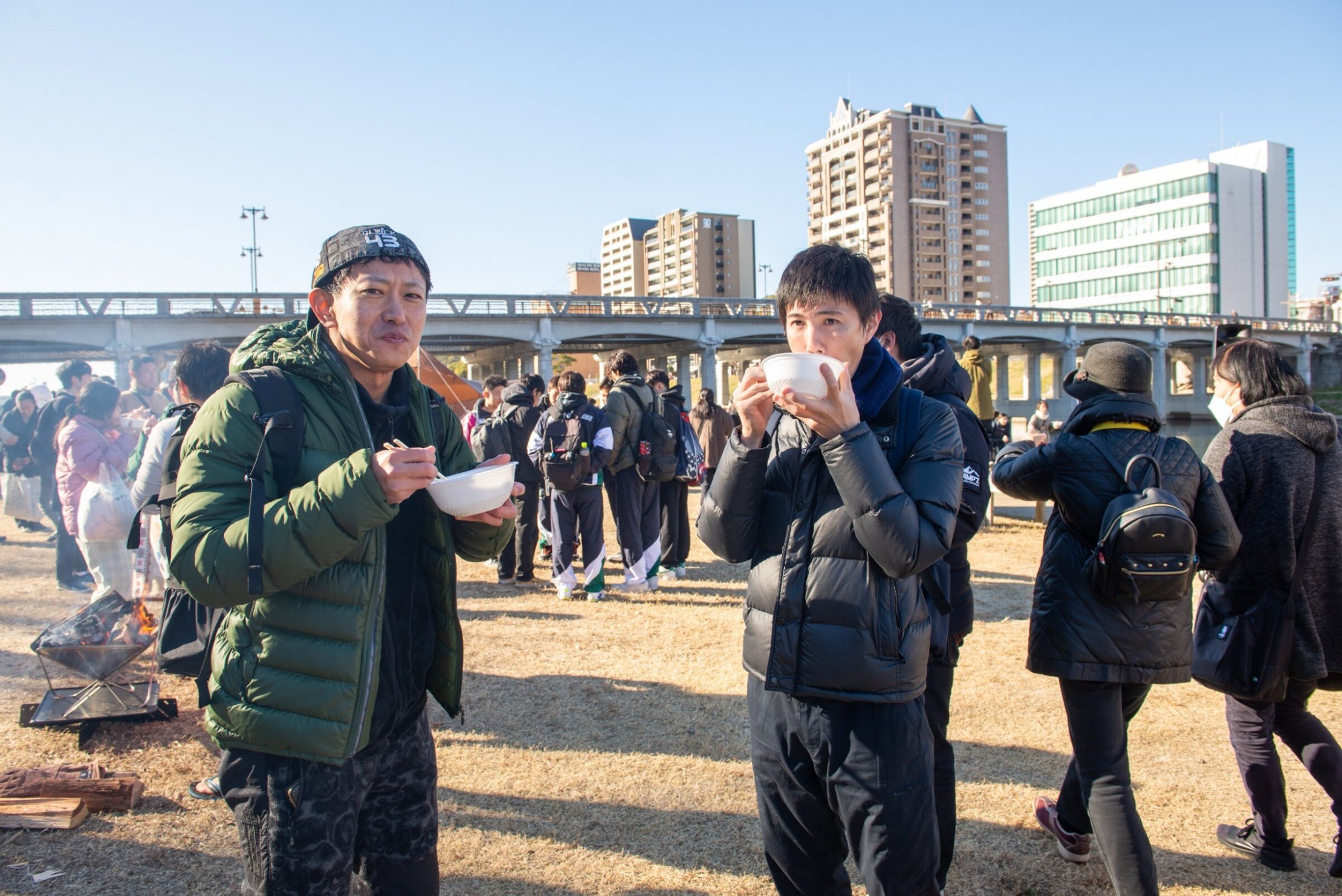 参加者さんからは、「思った以上に冷たかったが泳げてよかった」「水に入った後の味噌汁が最高においしい」「来年は対岸まで行けるように頑張りたい」「若者に負けず泳ぎ切れてよかった!」などの感想をいただきました。