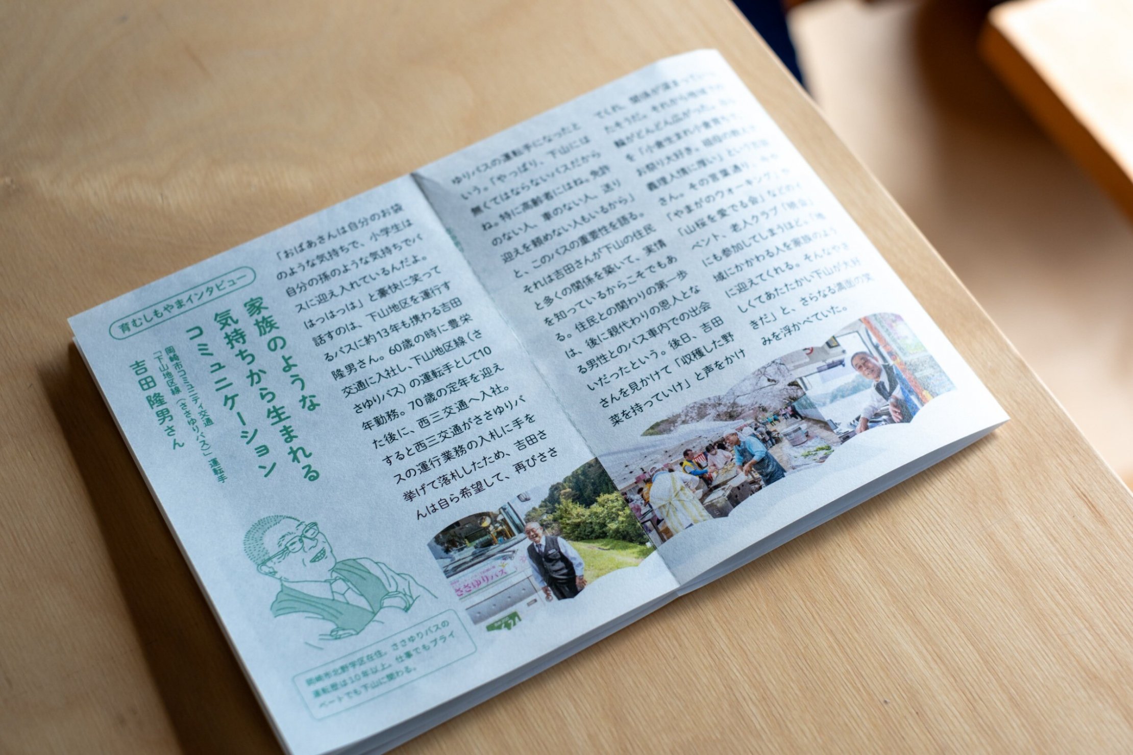 下山とバスのある風景編では、地域の皆さんに愛されるコミュニティ交通「ささゆりバス」に光を当て、ささゆりバスの名物運転手の吉田さんやバスを利用し小学校に通う瀬戸さん家族の声を掲載しています。また、下山が育てる子供たち編では、下山小学校の特色ある教育をテーマに下山小学校の鈴木校長や下山小卒業生であり、いまはご自身のお子さんを下山小に通わせる柴田さんの声を掲載しています。