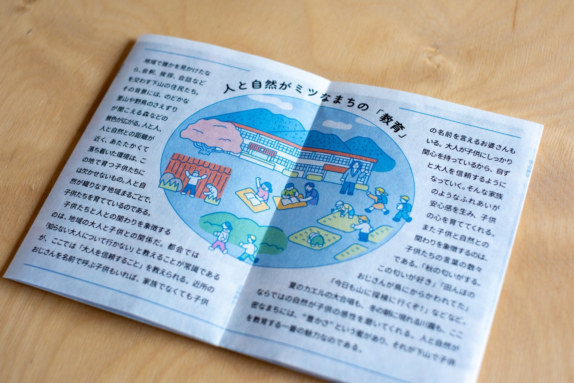 農村型RMO(農用地の保全や生活支援を行い、持続可能な地域社会づくりを担う地域運営組織)の設立に向け、さまざまな取組みをご一緒している下山地域づくり協議会にて、下山の魅力を発信する啓発パンフレット「しもやま育ち」の発行のお手伝いをさせていただきました。