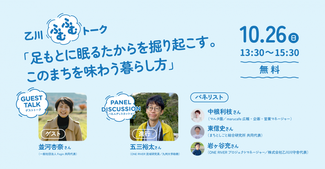 10月25日(土)26日(日)の二日間でONE RIVERが主催して実施する乙川の啓発イベント「ある日の乙川」にて、川からまちを考えるトークイベント「乙川ふむふむトーク」を開催します。今回は「足もとに眠るたからを掘り起こす。このまちを味わう暮らし方」をテーマに、京都府亀岡市より並河杏奈さんをゲストにお招きし、このまちをもっと味わう暮らし方を切り拓く3名のパネラーとともに、このまちの魅力について深掘ります。
