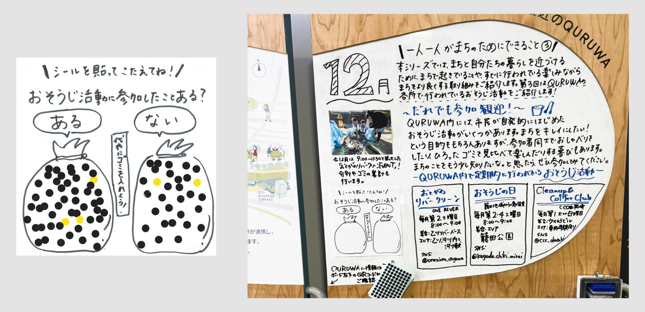 QURUWAエリアの回遊促進と情報発信を目的に、ONE RIVERではりぶら内のボードを毎月更新しています。