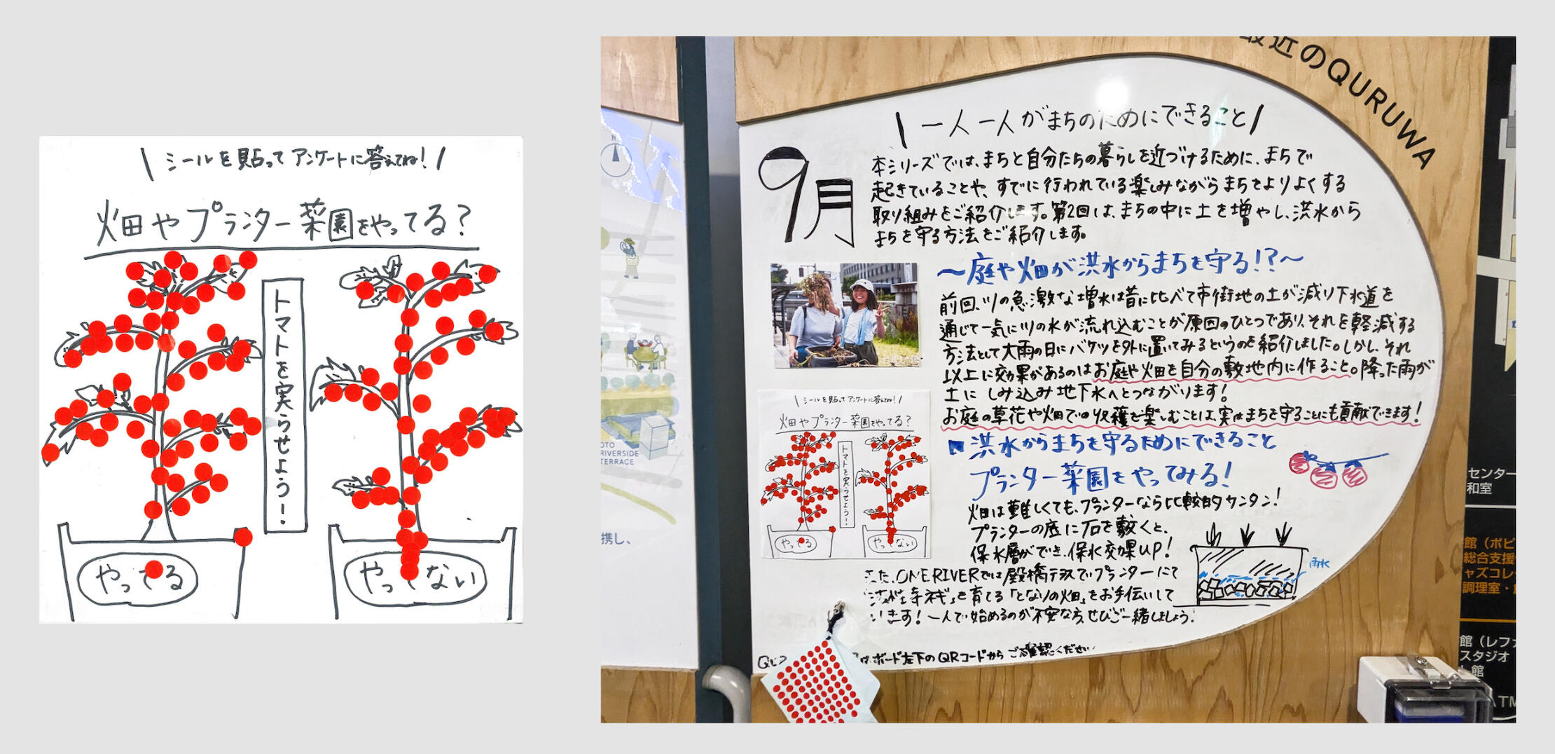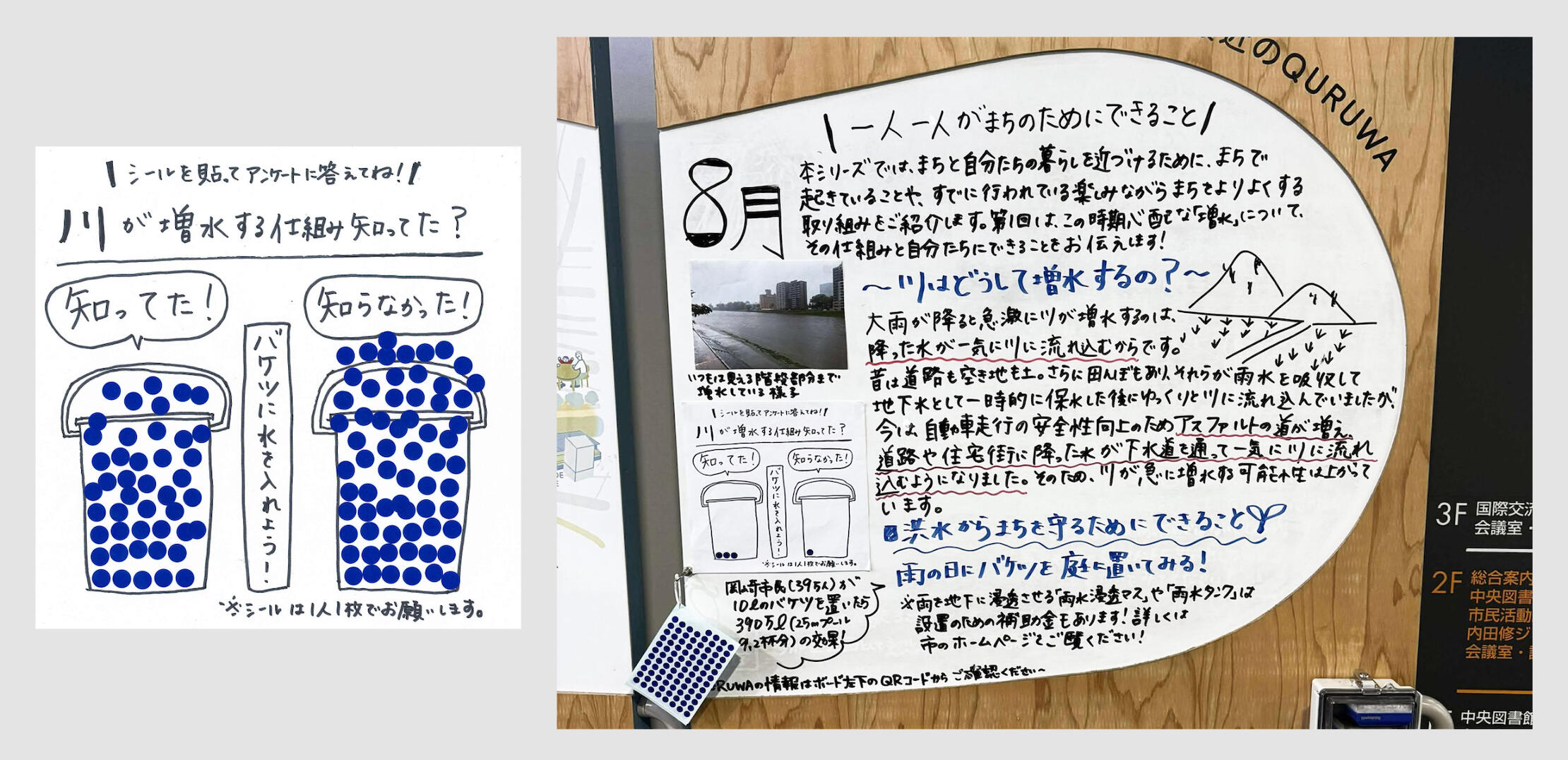 ≫QURUWAボードの本編企画「一人一人がまちのためにできること」第一弾として「川はどうして増水するの?」や「洪水からまちを守るためにできること」を紹介した8月。雨の日にバケツを庭に置くことで、一時的に雨水をキープ(一気に川に流さない)が直感的に伝わるデザインとなりました!