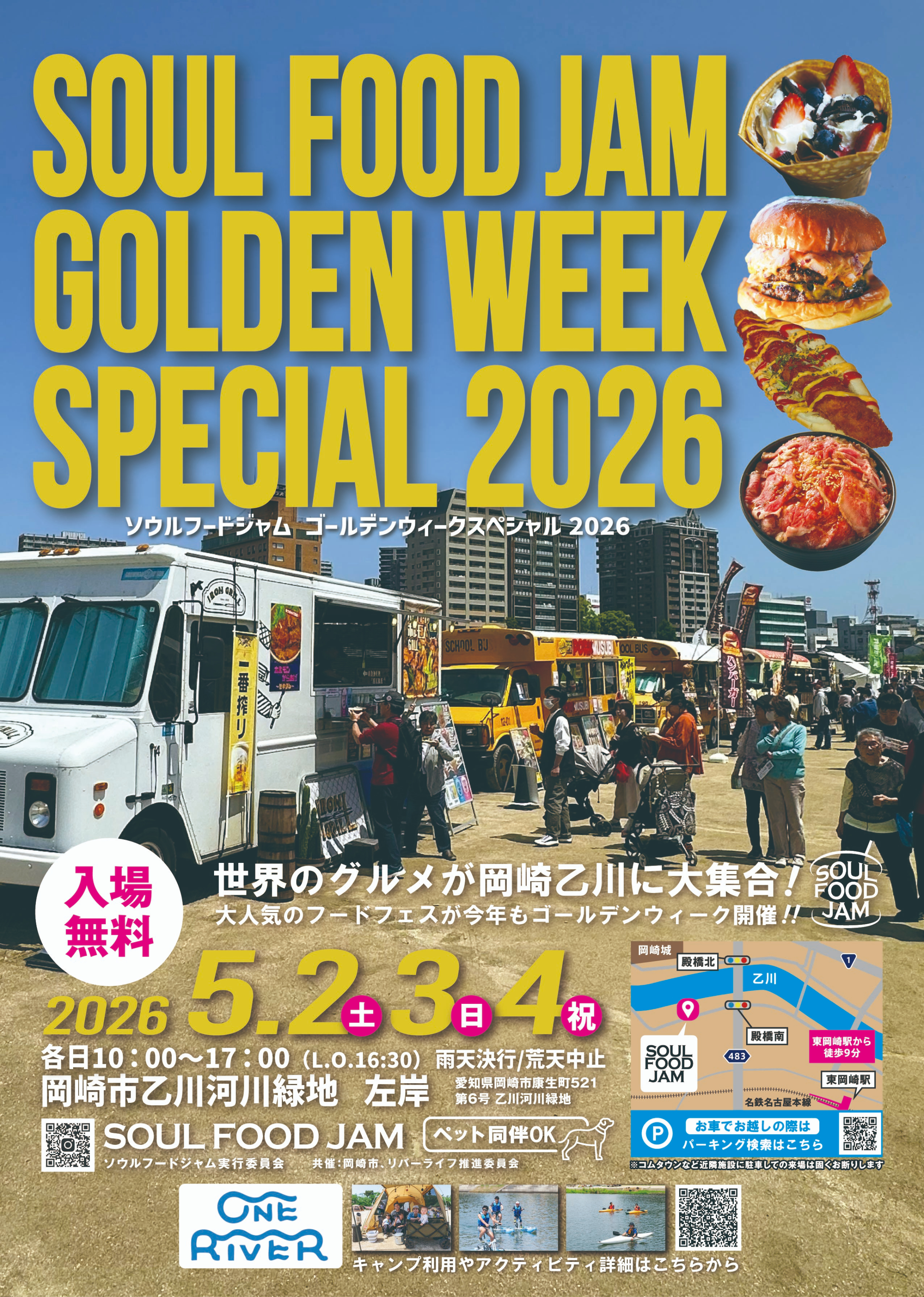 | 開催日 | 2026年5月2日(土)~4日(月) ※少雨決行、荒天(河川の増水が見込まれるような天候)の場合は中止。 ※当日は対岸にてフードイベント「SOUL FOOD JAM」が開催されます。 |