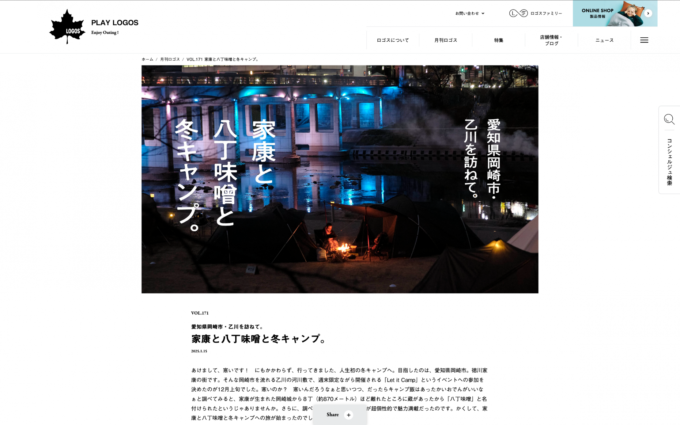 アウトドアブランドのLOGOSが運営するウェブメディア「月刊ロゴス」にて、ONE RIVER で運営するまちなかキャンプ企画「Let it Camp」を取材していただきました。特集テーマは「家康と八丁味噌と冬キャンプ」です。編集長自らが冬キャンプデビューをし、八丁味噌をたっぷり使った味噌おでんを作るという体験を記事にしていただいています!また前編(編集長のひとり旅)の編集長が岡崎のまちを探索し、岡崎のお店や名所をご紹介いただく記事もとても楽しい内容になっています。前後編を合わせてぜひお楽しみください。