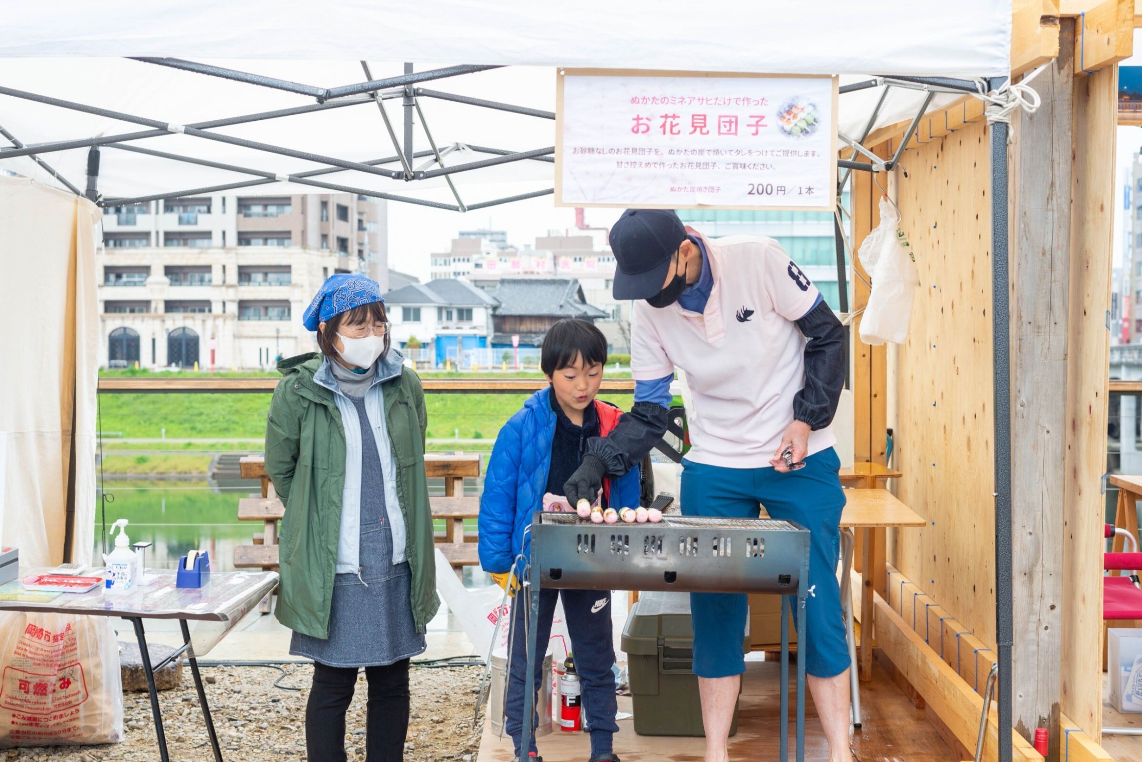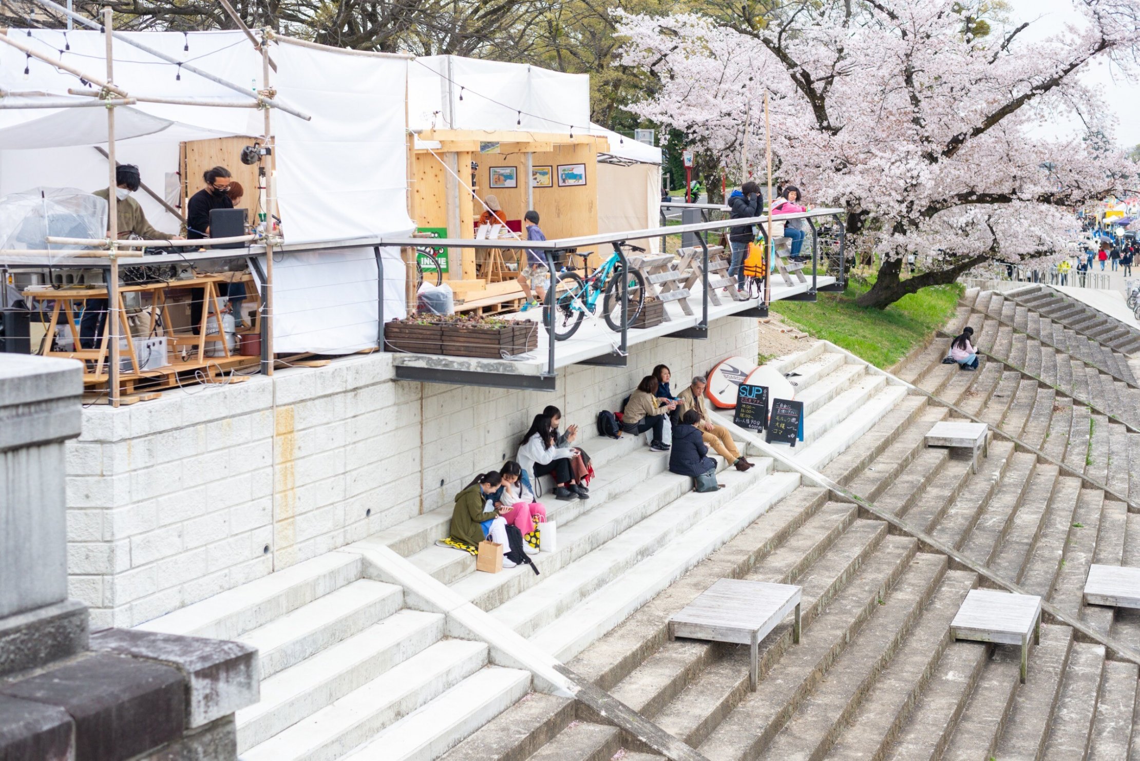 川とまち、川と山、人と人がつながる。かわまちづくりの拠点としての役割を担う、ONE RIVER が運営するベース拠点です。期間中はオフィシャルグッズの販売、アウトドアギアの貸出し、お花見休憩スペースの提供、「桜まつりクリーン」の実施、乙川の活動(かわまちづくりの活動)展示、そして河川敷を使った各種アクティビティ(SUP・レンタル自転車・ヨガ等)の体験受付等を実施します。体験を通して、この場所(乙川)の新しい楽しみ方を発見してもらうきっかけをつくります。