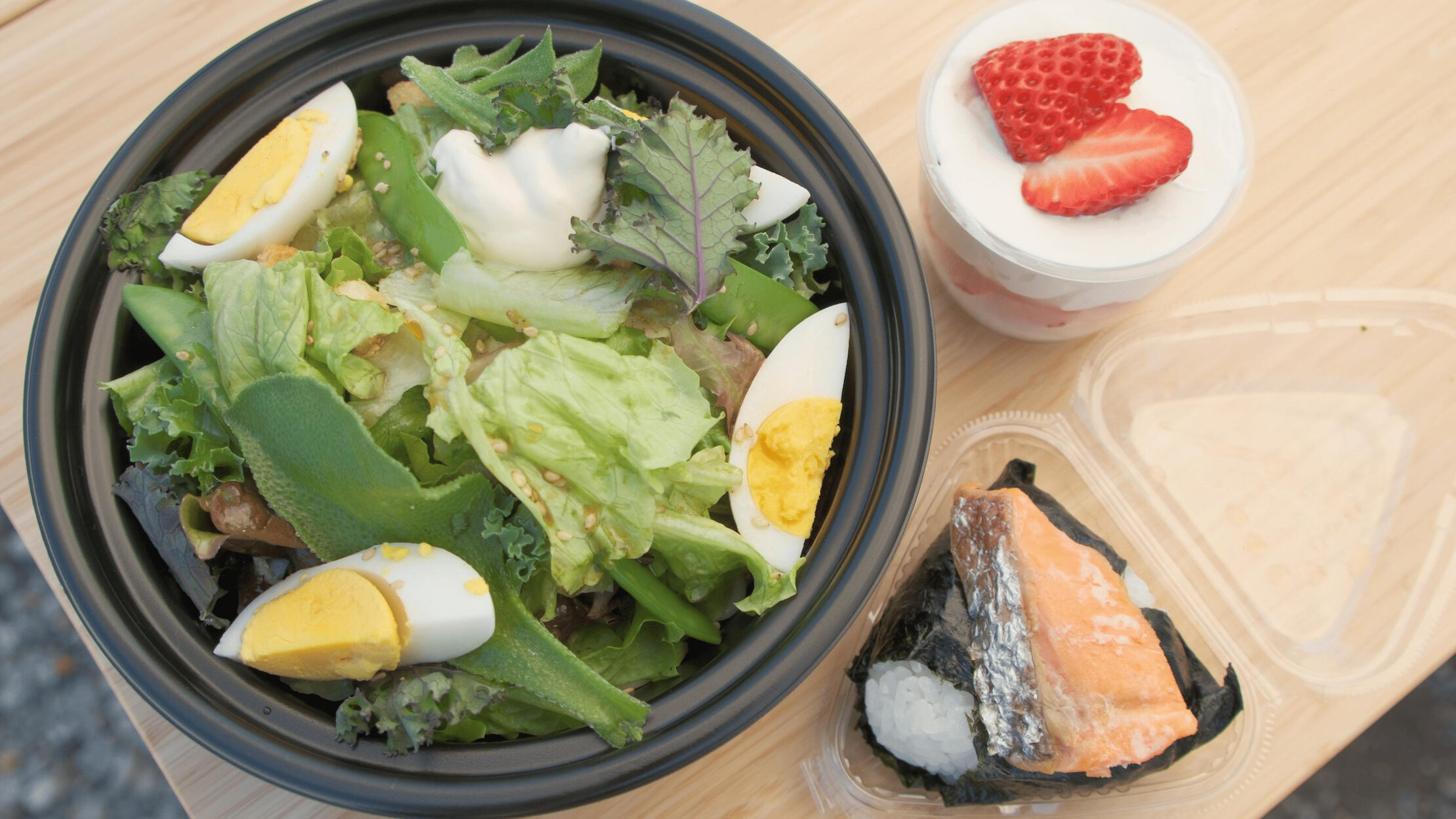 お食事には、レタスやケール、スナップエンドウなどを使ったサラダスパゲッティや、ツヤツヤふわふわのお米を使った鮭のおにぎり、瑞々しいイチゴのパフェをご用意いただき、何よりもまずは食材を身体で摂取するところから有機野菜への取り組みを学んでいきました。