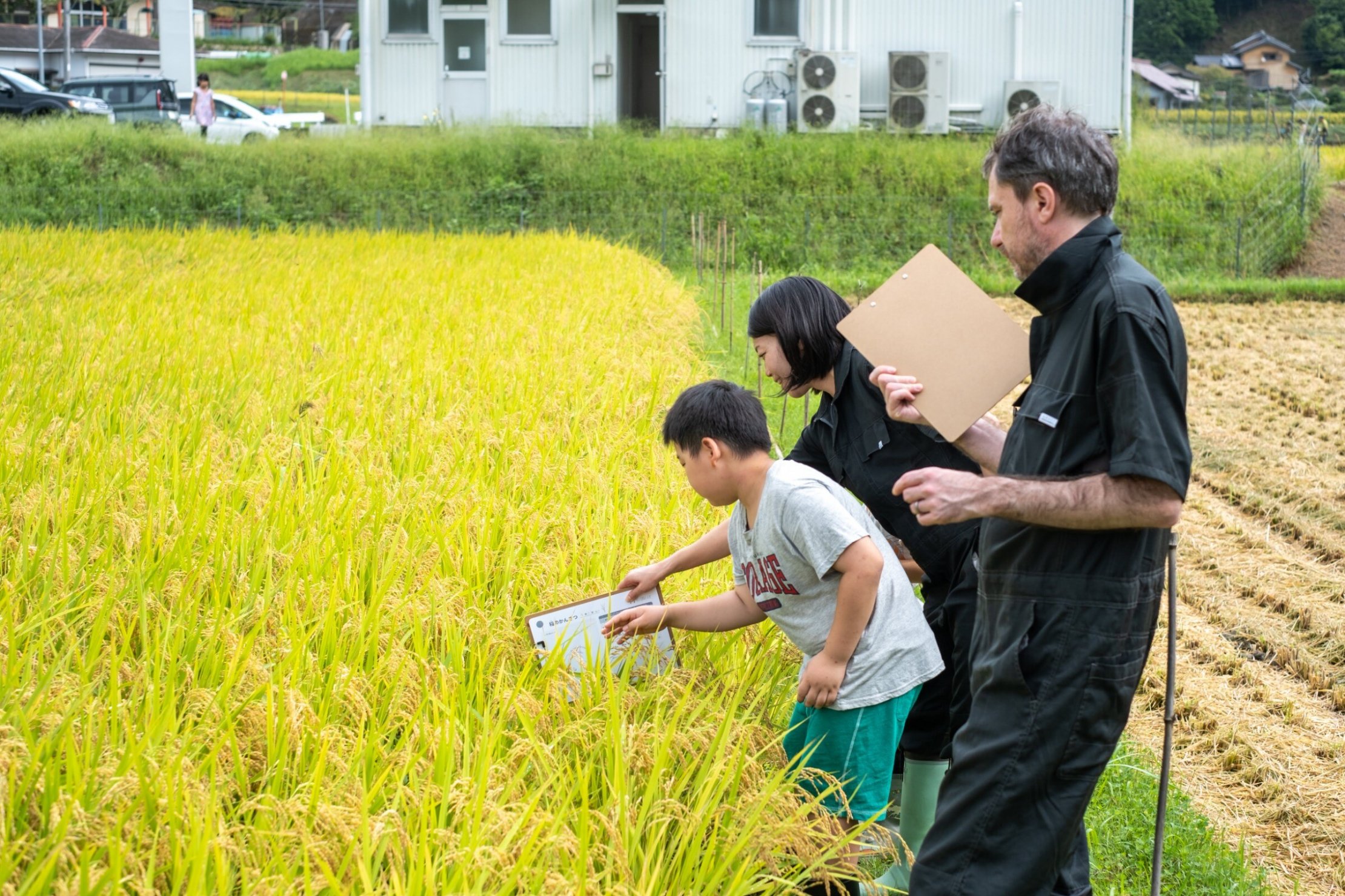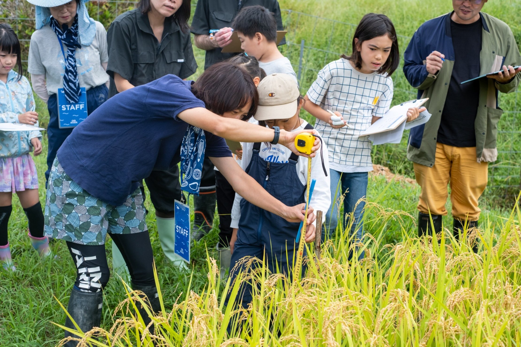 まずは、田んぼで収穫前の稲の観察です。前回と前々回の観察の数字と比べながら、どれほど大きくなっているかと期待して計測!しましたが、8月からはほとんど大きくなっておらず、みんなでびっくりしました。ですが、前回は青かった葉っぱが黄色に変わりお米もしっかりできていて稲の様子が随分変わっている様子をじっくりと観察しました。こどもたちの中には1つの穂にいくつ実がついているか数える子もいて、お茶碗一杯分のお米だとどれぐらいの本数が必要なんだろうかと親子で計算する姿も見られました。絵を描き色塗りをしたものを各自発表して観察は終了。