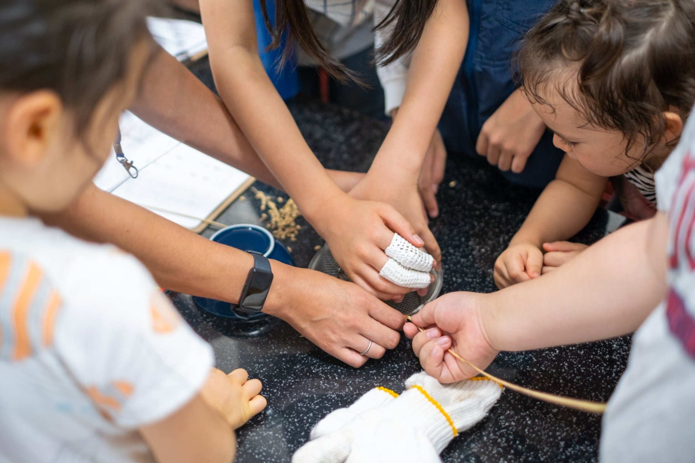 積極的な子どもたちが、われ先にとアシスタントを申し出てくれ、ぎゅうぎゅうになりながらやってみると…綺麗にお米の粒が取れました。そして、もみ殻と玄米を分ける脱穀作業も、すり鉢とソフトボールで体験。こちらも子どもたちが順番を争いながら実践し、無事に玄米を取り出すことができました。