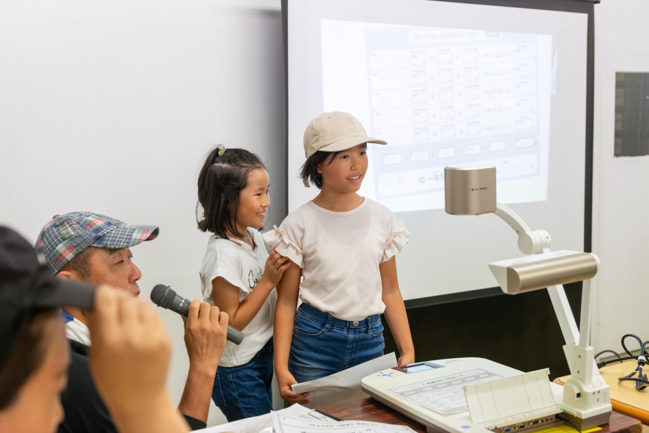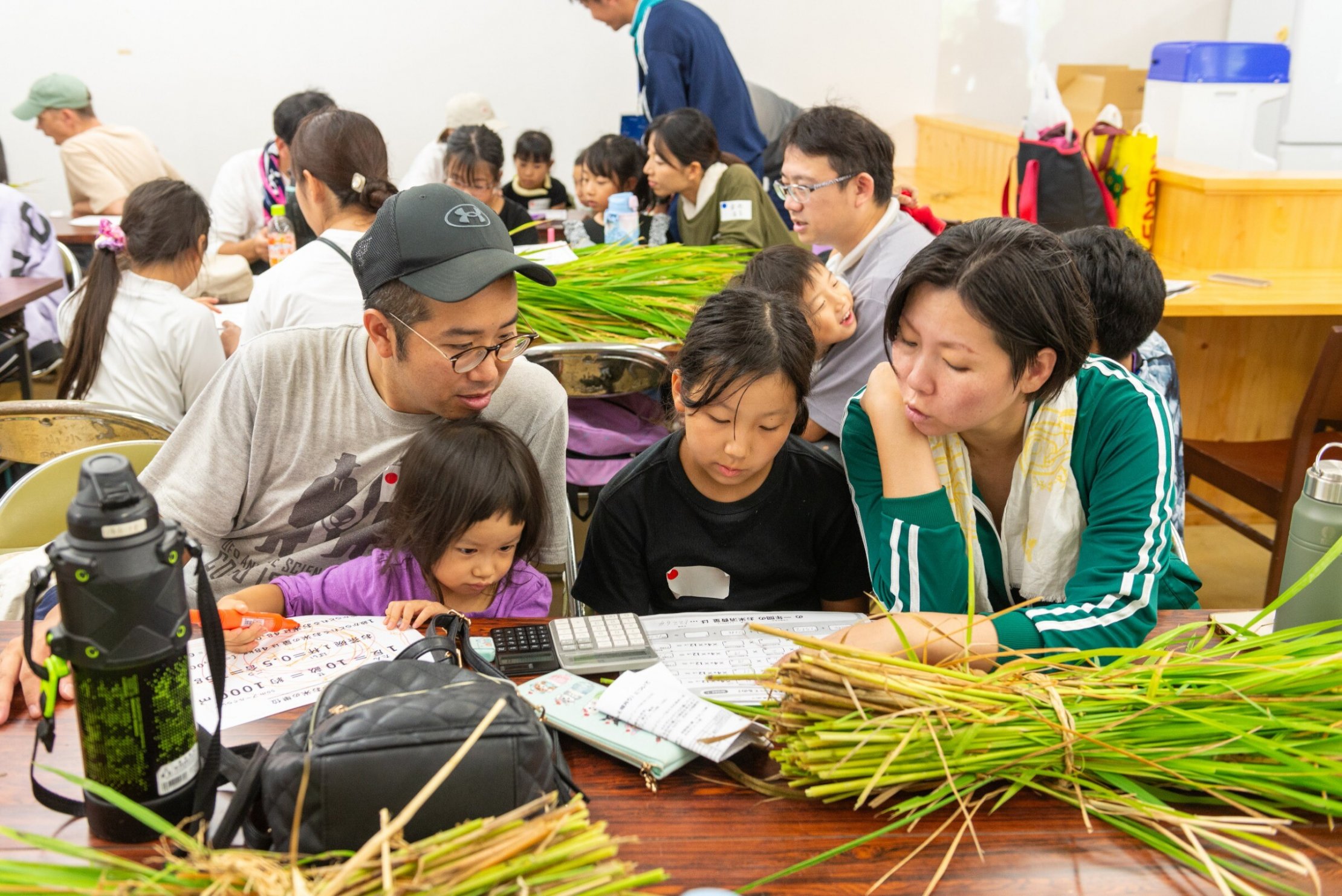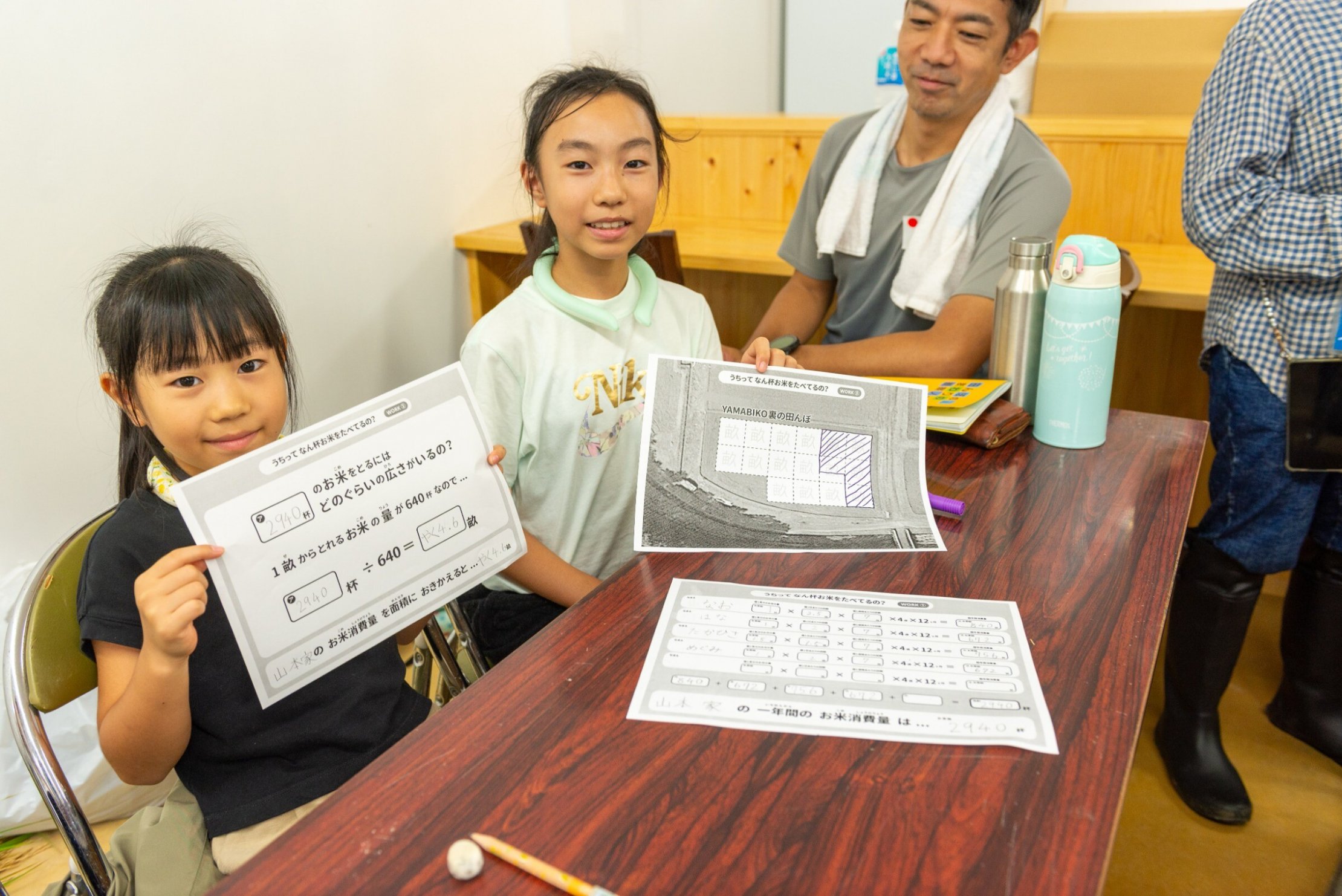 プログラム後半は、頭を動かす「うちってなん杯お米を食べているの?」ワークの時間です。タイトルの通り、家族の一年間のお米消費量がなん杯なのかを計算するワーク①、家族のお米消費量を面積に置き換えるワーク②、そして最後にその面積がとなりの田んぼのどのくらいの広さ(単位:畝(1畝₌約100㎡))を占めているか可視化するワーク③。一日に自分たち家族がいったいどれだけの量を食べているのか。ワークの最初にどのくらいの広さか予想して、その予想と計算で出た結果の比較では「おもっていたより広かった」といったコメントなど、体験と計算を通じた実感を持ち帰ってもらえたのではないかと思います。