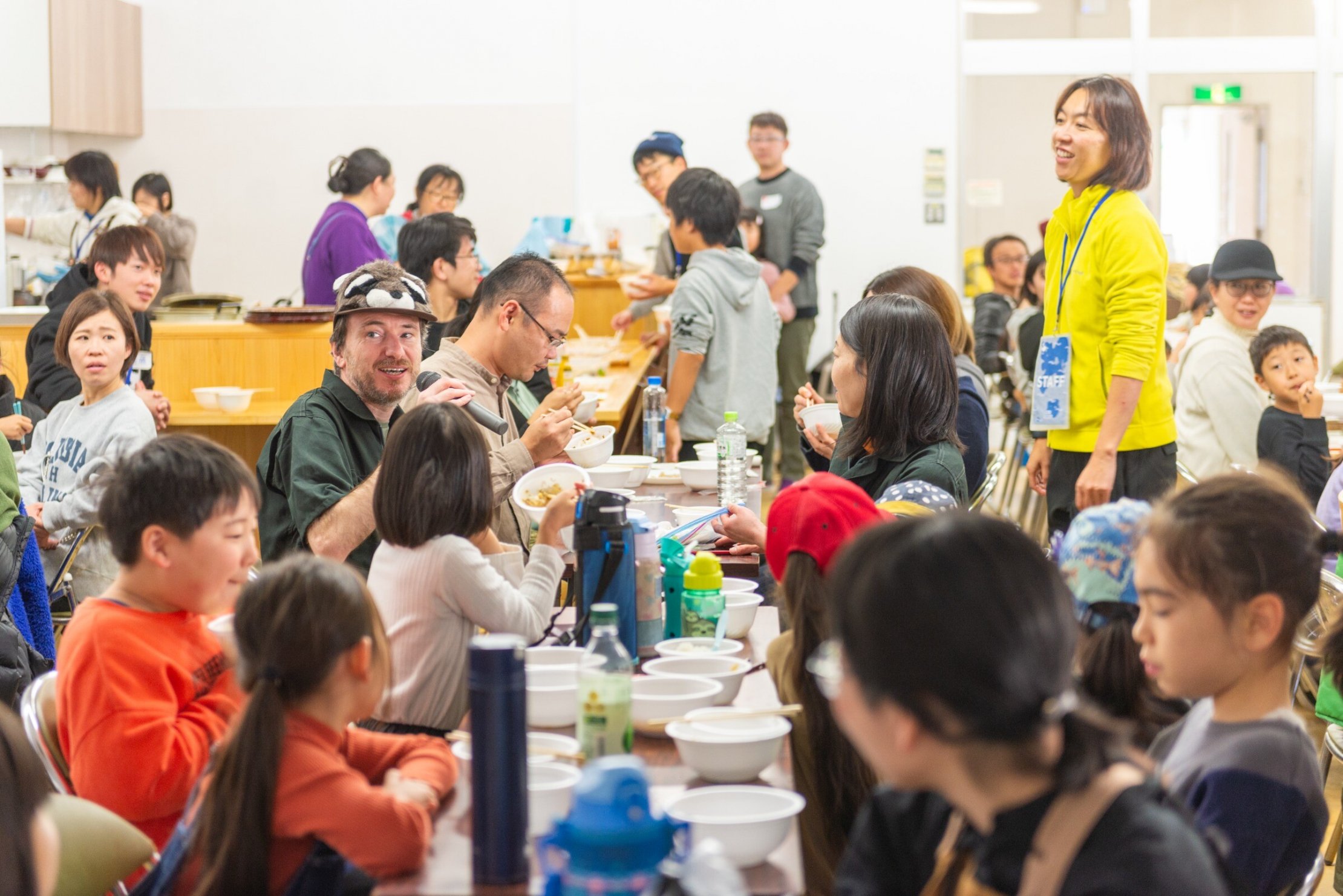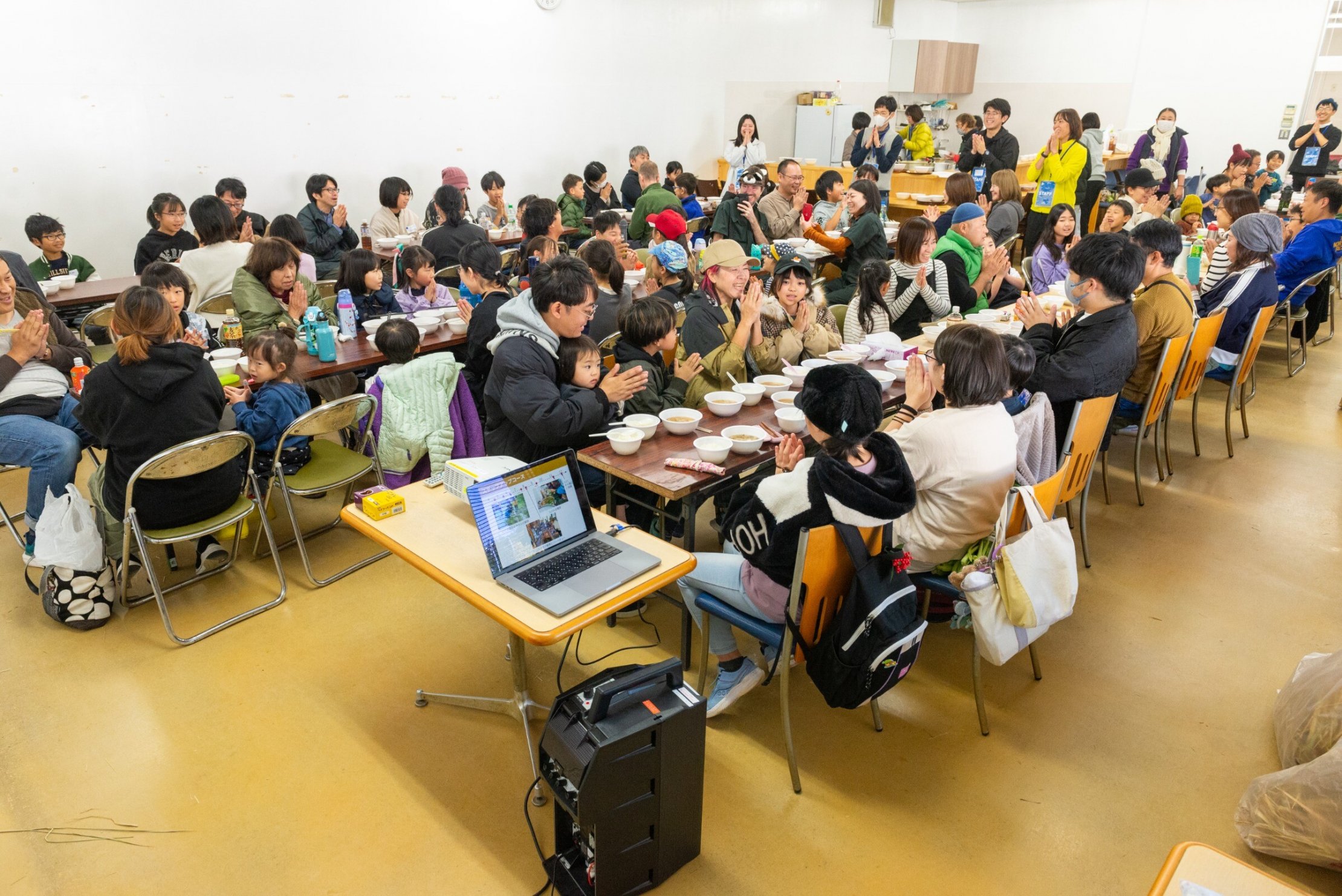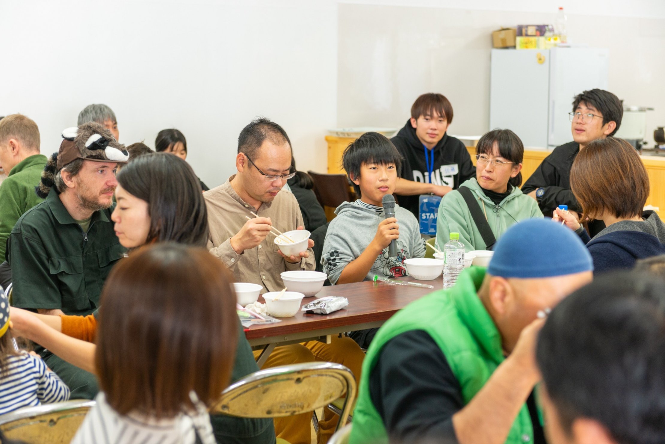 1年のプログラムの集大成、自然の恵みに感謝を込めた「収穫祭」として、炊き立てのミネアサヒと下山地域で採れたお野菜を使った豚汁&猪汁、そして1年間となりの田んぼを支えてくださった下山地域の成瀬ひろみさんが作ったお漬物のふるまいがありました。ステップアップコース(となりの田んぼ2年目の方が参加する、より自主性を高めたコース)参加者と一緒に「いただきます」。美味しいお米と温かい汁に舌鼓を打ちながら、しばしの歓談タイム。何度もおかわりする子どもたちが印象的でした。自分たちが通ってきた1年間を振り返りながら食べるミネアサヒは格別だったのではないでしょうか。