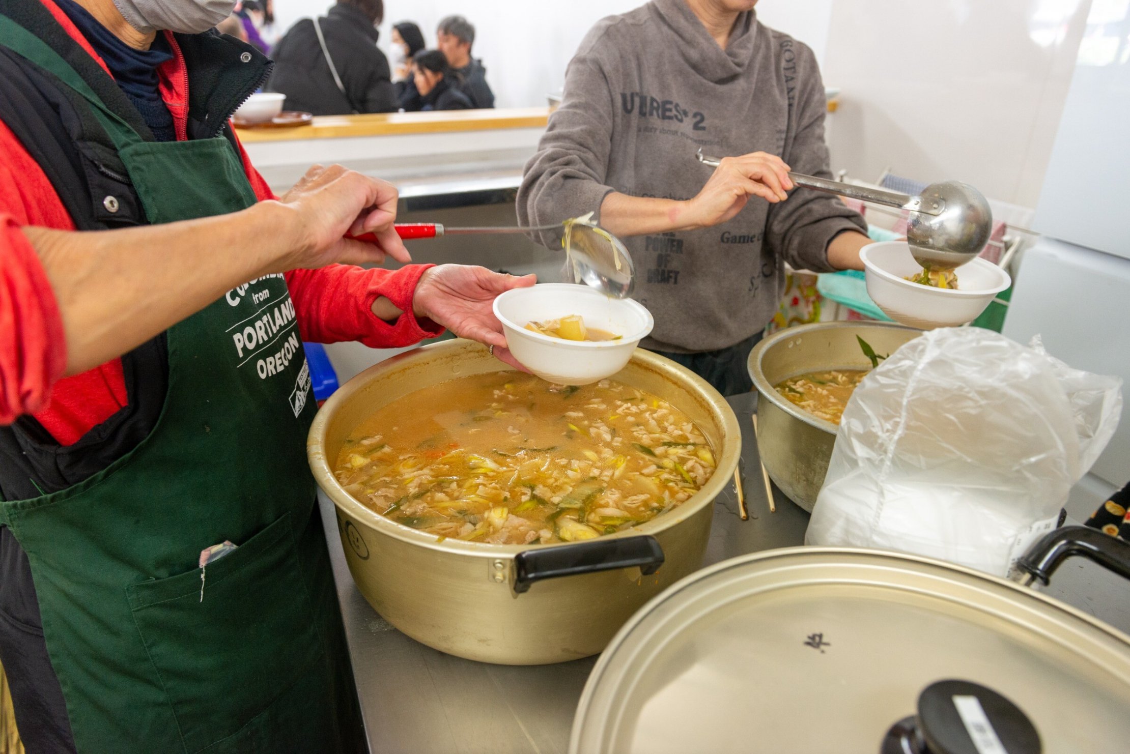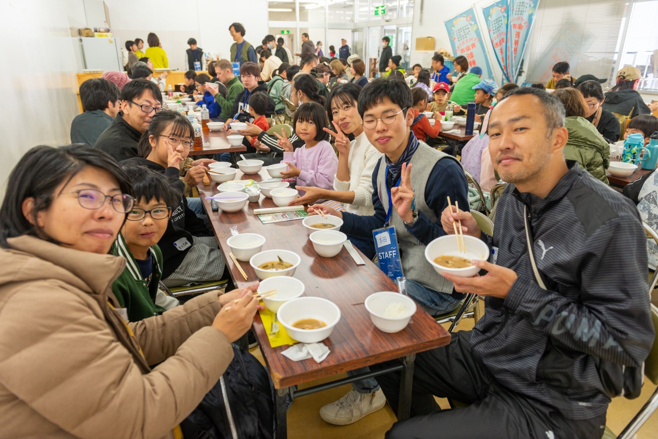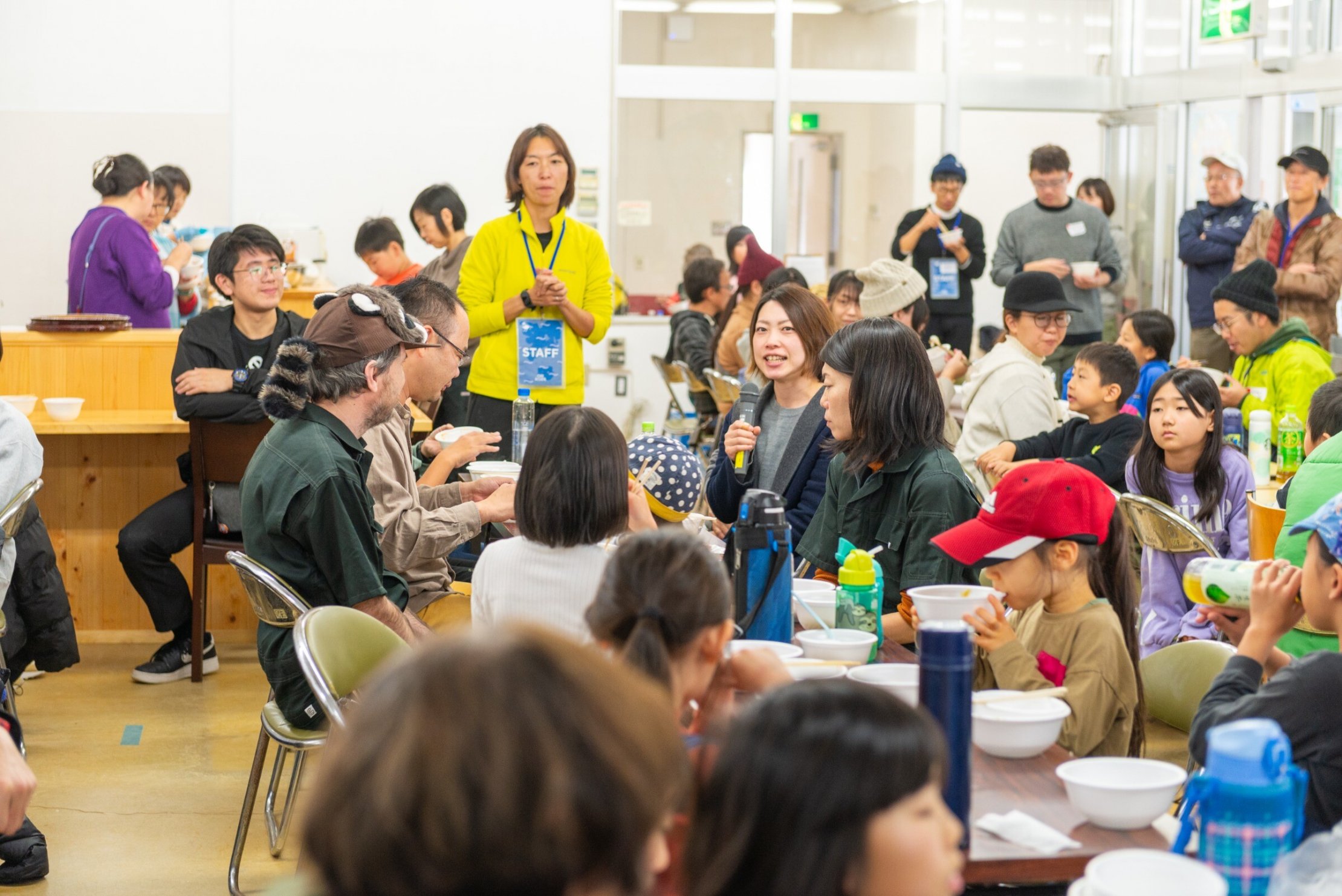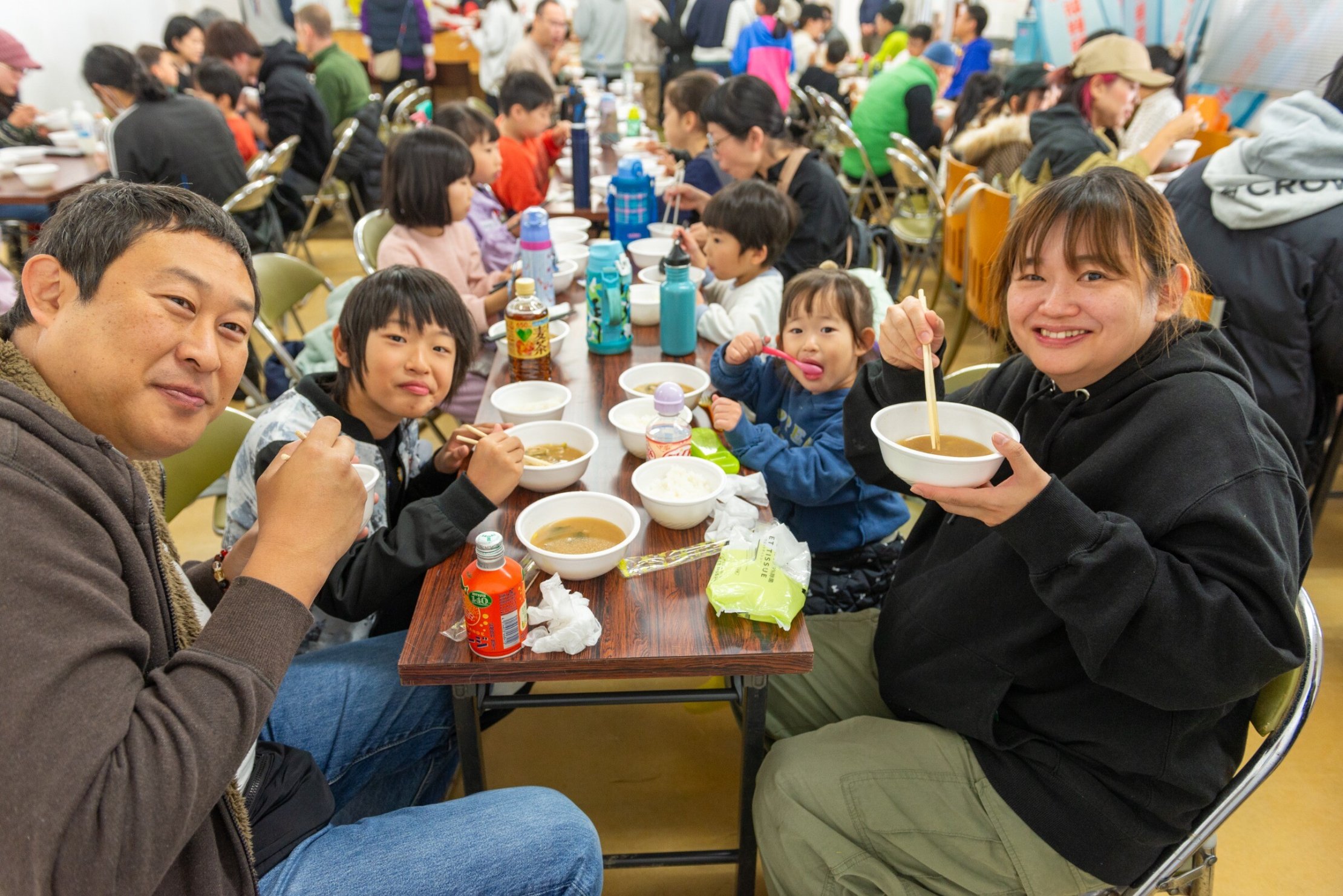 1年のプログラムの集大成、自然の恵みに感謝を込めた「収穫祭」として、炊き立てのミネアサヒと下山地域で採れたお野菜を使った豚汁&猪汁、そして1年間となりの田んぼを支えてくださった下山地域の成瀬ひろみさんが作ったお漬物のふるまいがありました。ステップアップコース(となりの田んぼ2年目の方が参加する、より自主性を高めたコース)参加者と一緒に「いただきます」。美味しいお米と温かい汁に舌鼓を打ちながら、しばしの歓談タイム。何度もおかわりする子どもたちが印象的でした。自分たちが通ってきた1年間を振り返りながら食べるミネアサヒは格別だったのではないでしょうか。