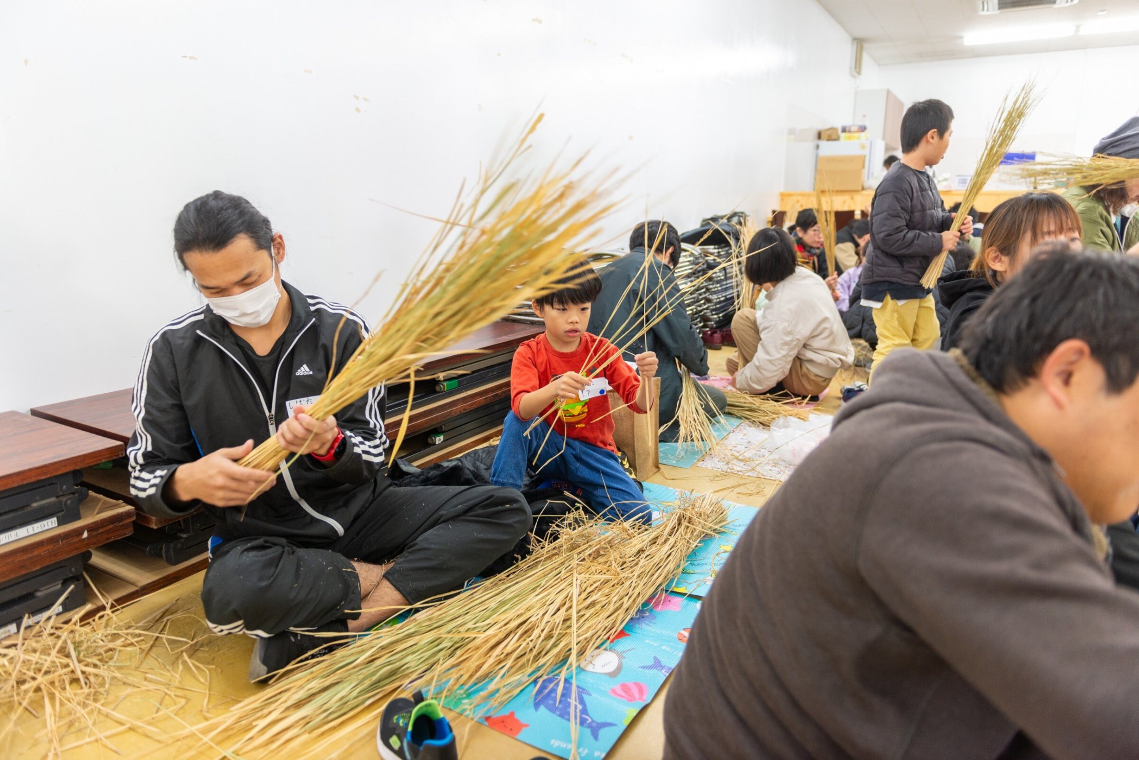 12月1日(日)、2024年度となりの田んぼプロジェクトのチャレンジコース第5回、「しめ縄づくり・収穫祭」を実施しました。今回のプログラムは、お米の脱穀後に残った稲わらを有効活用した「しめ縄(しめ飾り)づくり」と、実際に田んぼで収穫したミネアサヒでつくったご飯をみんなで食べる「収穫祭」です。前回プログラムの「稲刈り」で自分で刈った稲をご自宅で脱穀してきてもらい、残った稲わらを参加者に持ってきてもらい、しめ飾りの材料としました。