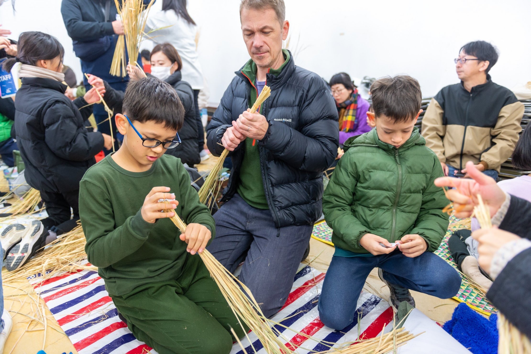 参加者の様子を見ていると、お父さんが根元をしっかりと抑えながら、お子さんとお母さんが一緒に束をねじっている様子など、各々ができるやり方で実施されていました。3束を綯ってしめ縄ができたら、くるっと一周してリースの形に。最後にそれぞれが持ち寄った小物を飾りつけ、オンリーワンのしめ飾りが完成です!