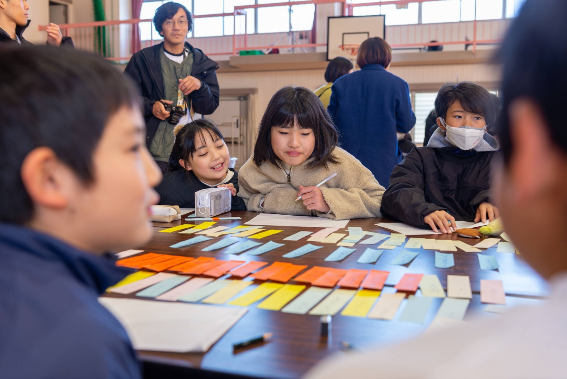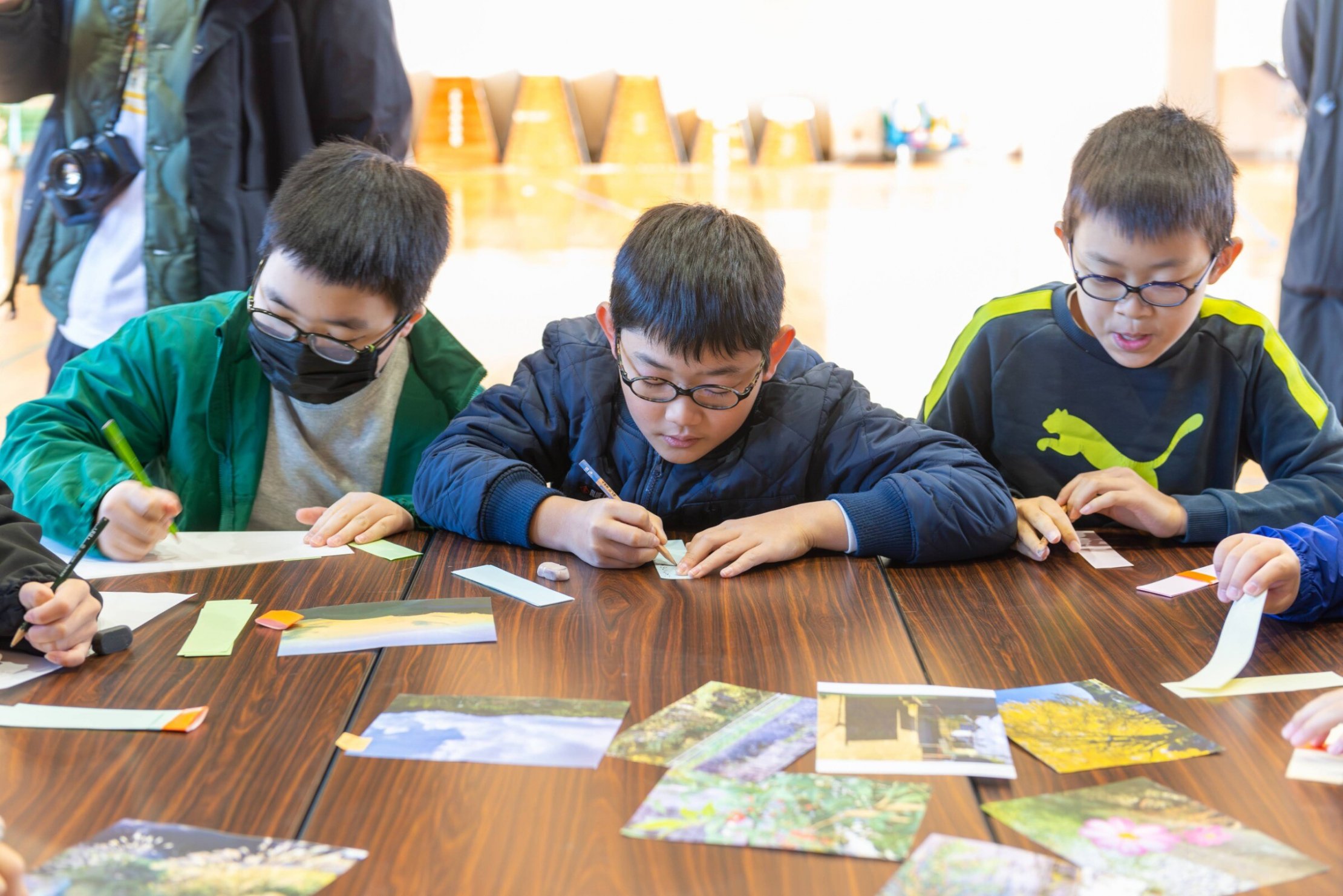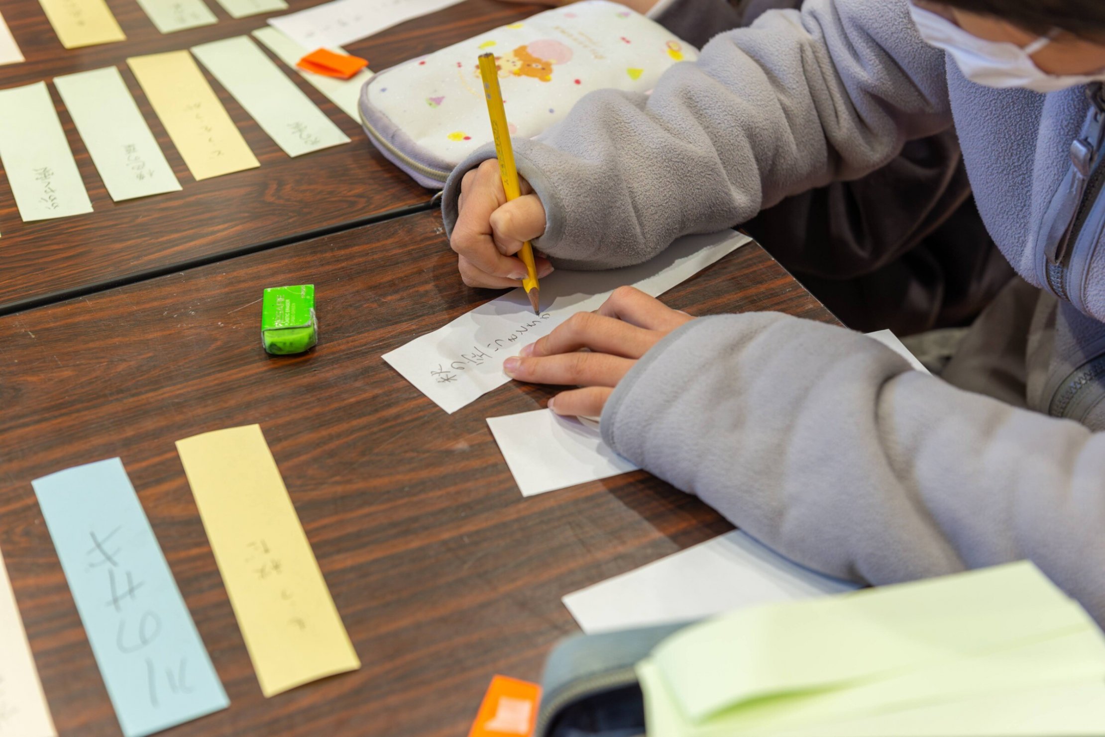 俳句ワークショップ当日に向けて、子どもたちには「通学路で見つけたまちの色」というテーマで事前に写真を撮ってきてもらいました。俳句づくりの一番はじめのステップとして、その写真をテーブルに並べ、俳句の素材となる五音を短冊状になった紙に次々と書いていきました。