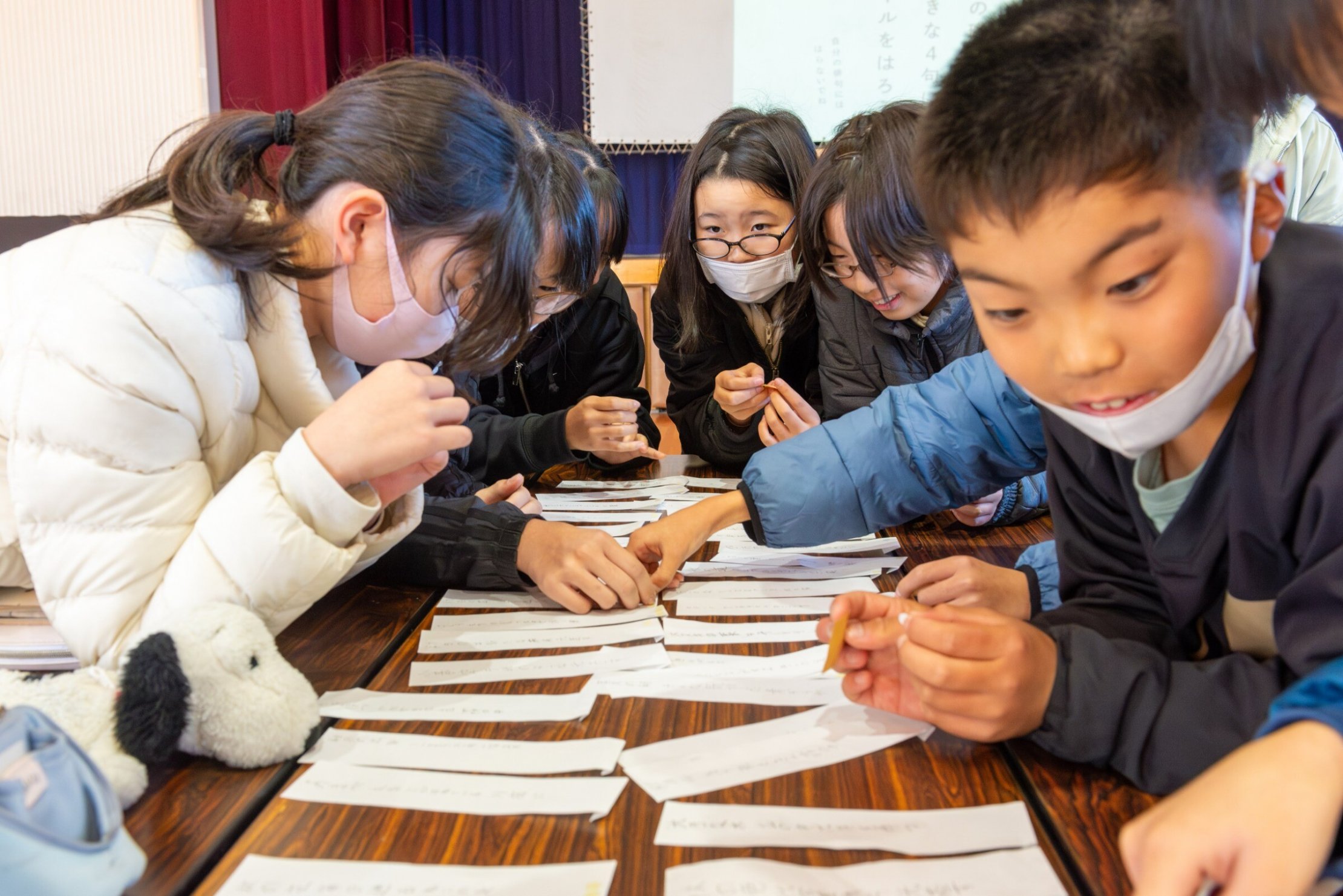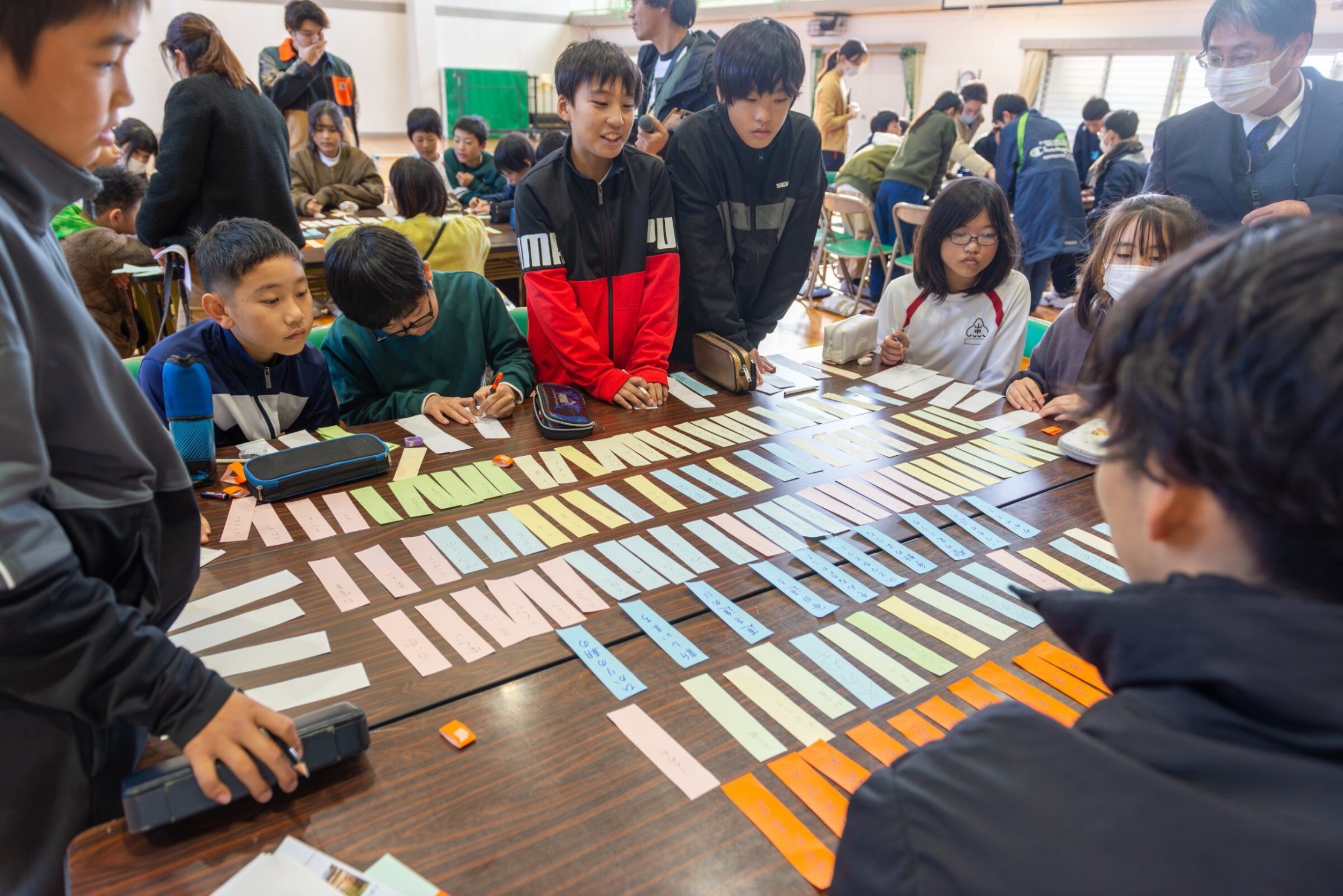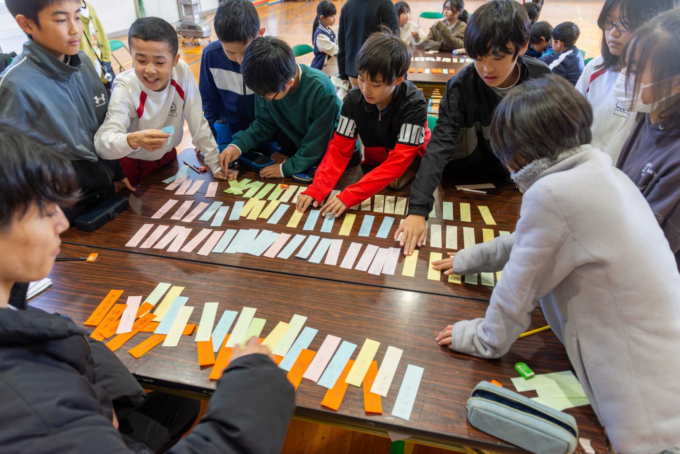 やがて言葉が書かれたカラフルな短冊がテーブルいっぱいになりました。これらの言葉を「季語の五音」と、「季語ではない五音」に分けました。「季語」と一言で言っても、とてもたくさんの種類があります。後藤先生にチェックしていただきながら、「こんな言葉も季語になるのか」と発見をしながら短冊を仕分けていきました。