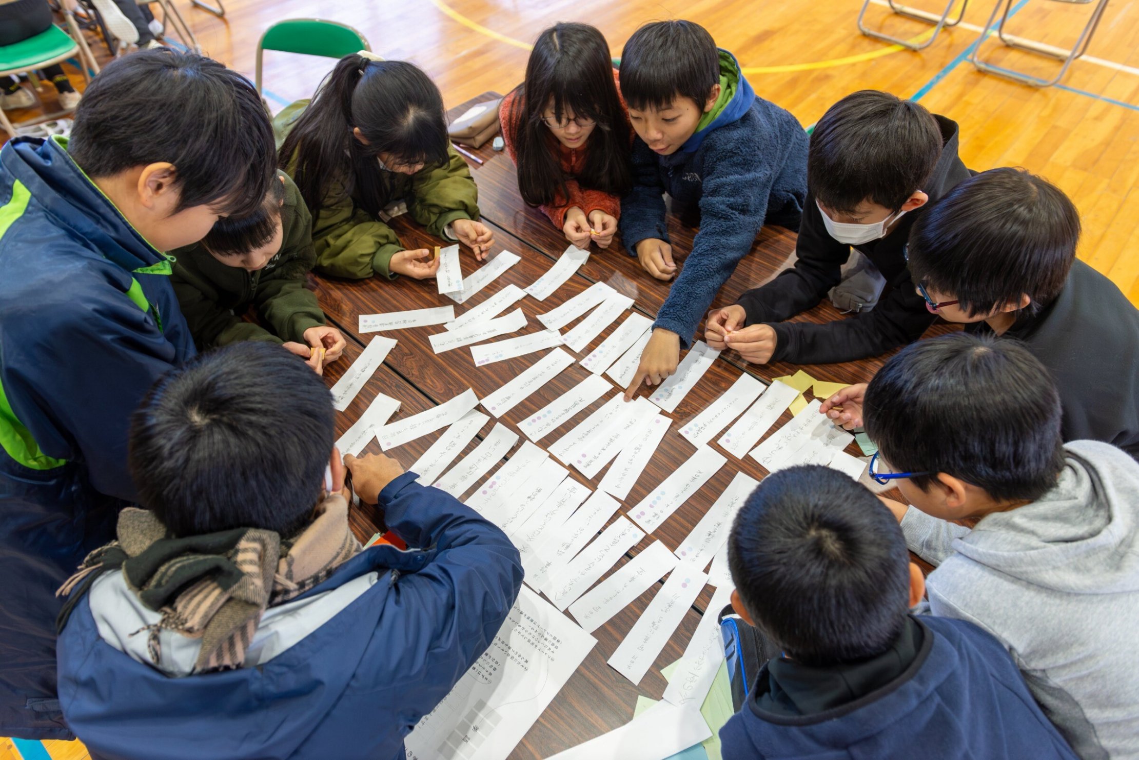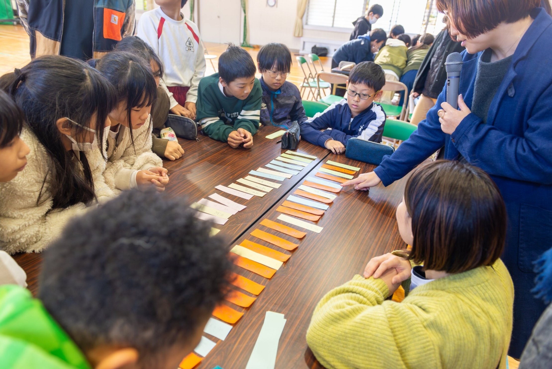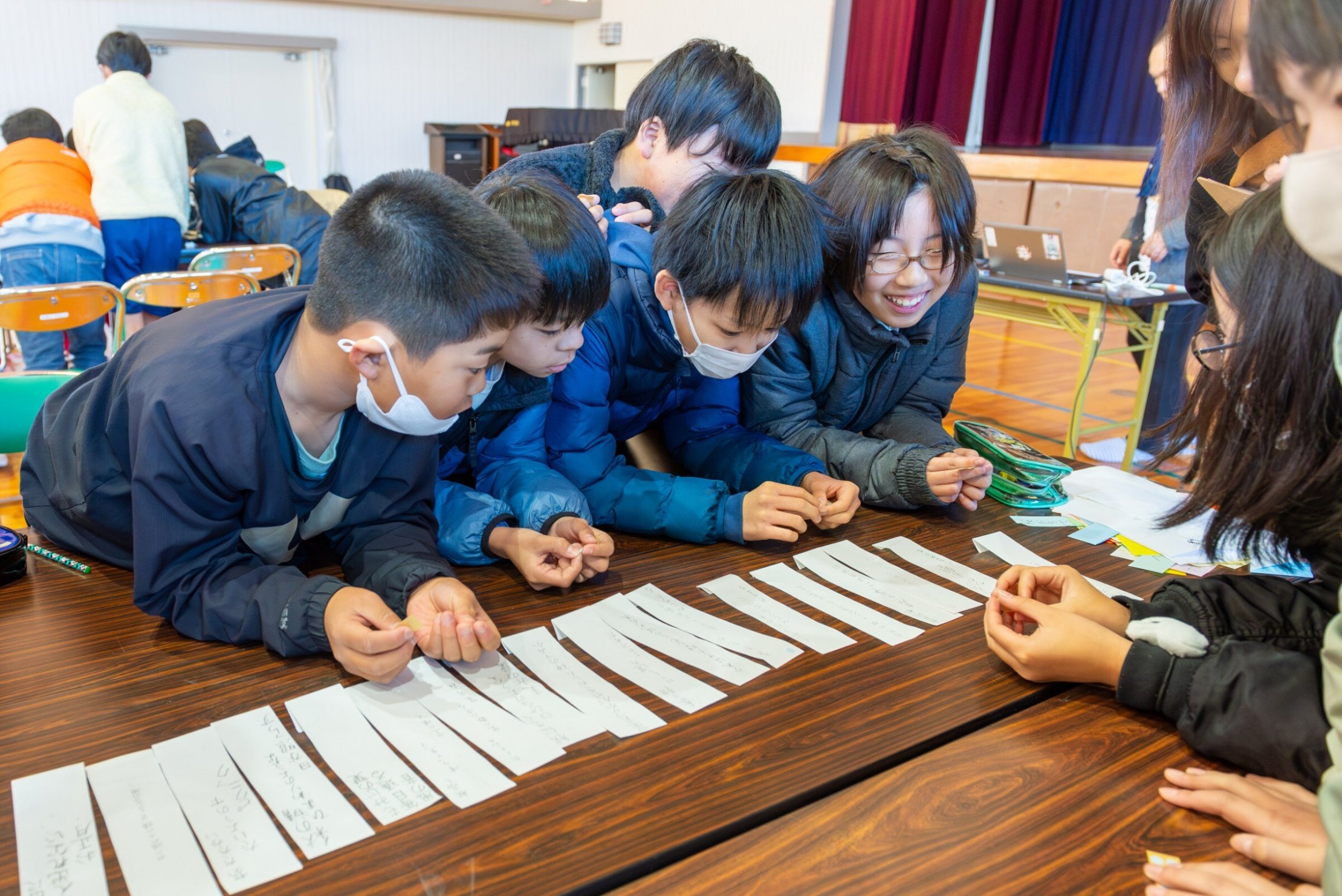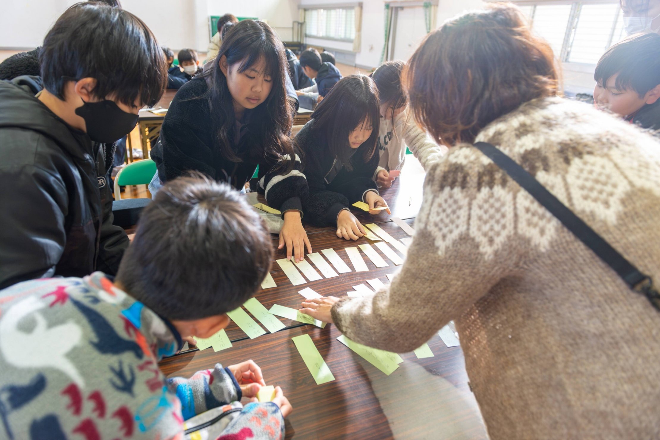 やがて言葉が書かれたカラフルな短冊がテーブルいっぱいになりました。これらの言葉を「季語の五音」と、「季語ではない五音」に分けました。「季語」と一言で言っても、とてもたくさんの種類があります。後藤先生にチェックしていただきながら、「こんな言葉も季語になるのか」と発見をしながら短冊を仕分けていきました。