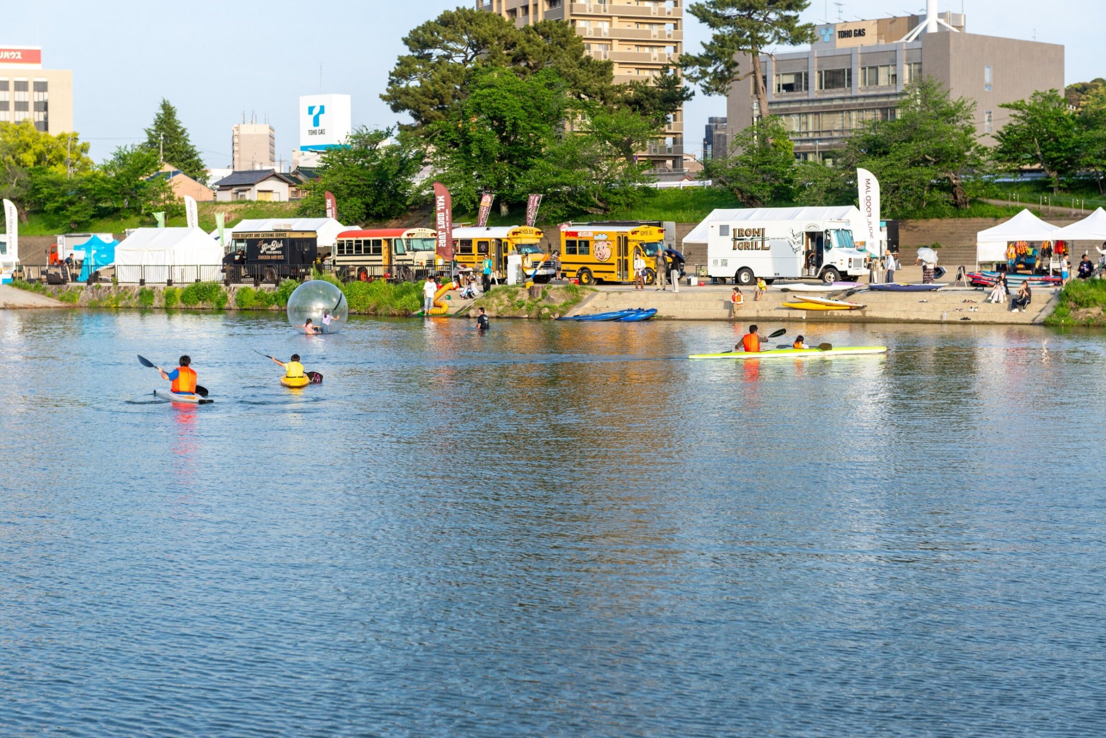 今回はLet it Camp単独の企画ではなく、乙川で人気のフードイベント「ソウルフードジャム」の運営者さんや、乙川でお馴染みのアクティビティ(観光船・SUP・自転車・ヨガ・カヌー)事業者の皆さんと共同で開催したものにです。。GWは乙川に遊びに行こう!行きたい!そんな場所になることを目指し、半年前くらいから構想を練り実現しました。願いが叶い、当日はキャンプを楽しむお客様はもちろんこと、そこを拠点にフードイベントで食事を楽しんだり様々なアクティビティ体験に家族でチャレンジするという、乙川のいまを最大限に楽しむ過ごし方の風景がたくさん生まれました。