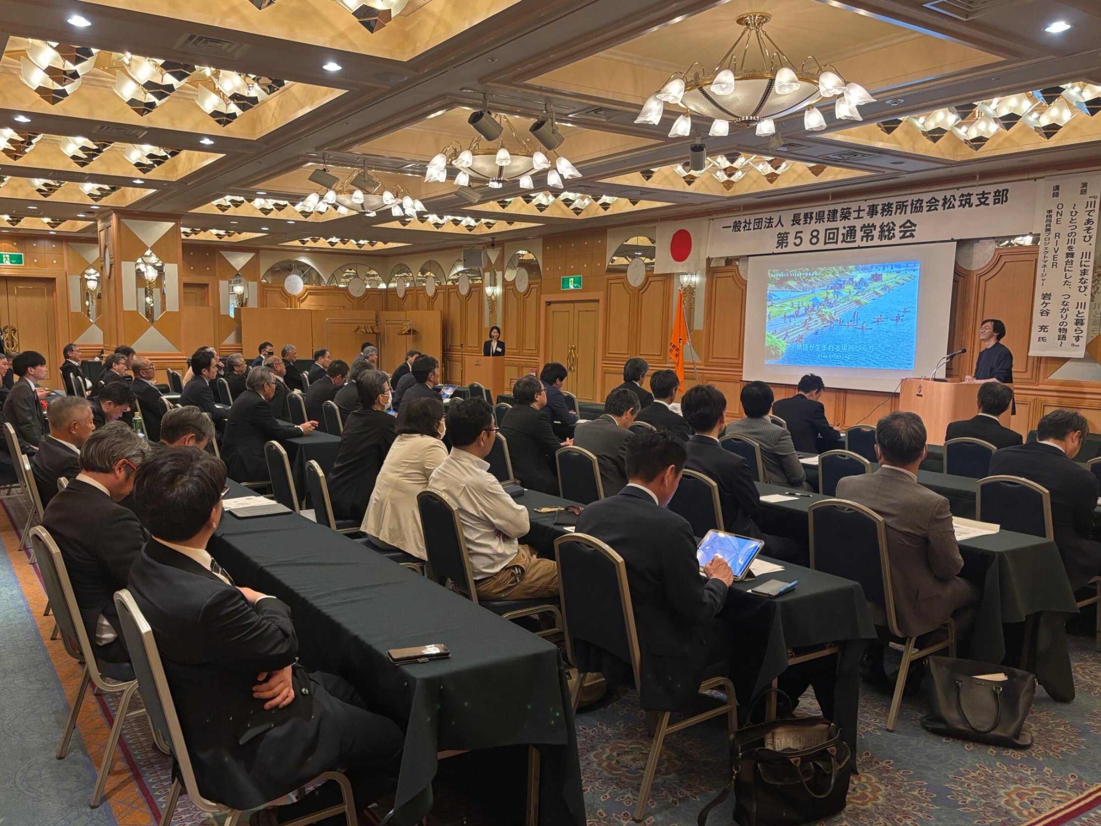 講演会の会場は、松本が誇るフルサービス型のホテル・ブエナビスタ。シャンデリア煌めく厳かな会場に気おされつつも、岩ヶ谷くんは見事大役を果たしました。岩ヶ谷くんが示したキーワードの一つ「川とともに生きる自然観」は、アルプスに囲まれ、山と川が身近にある松本の皆さんには強い共感を得ていたと感じました。懇親会でお話した建築士事務所協会の方々は、山小屋を運営されていたり、フライフィッシングをされていたり(岡崎の杉坂ブラザーズのこともご存じでした!)、女鳥羽川だけでなく、松本を流れる川や松本を囲む山々のことについて教えていただき、とても刺激的でした。余談ですが、事務所協会総会に際し祝辞を寄せられた松本市長のお名前は臥雲(がうん)市長。臥雲と言えば、岡崎市民的にはガラ紡を発明した臥雲辰致が思い浮かびます。もしやと思って尋ねると、なんと臥雲市長は臥雲辰致の曾孫だと判明し、岩ヶ谷くんと盛り上がり(笑)。逆に松本の方には「なぜ臥雲辰致を知っているのか?」とびっくりされました。ホテルでの懇親会後、地酒が美味しい飲み屋、仄暗いムードの大人なバー、路地を入ったアングラなバーなどをはしごし、夜は更けていくのでした。
