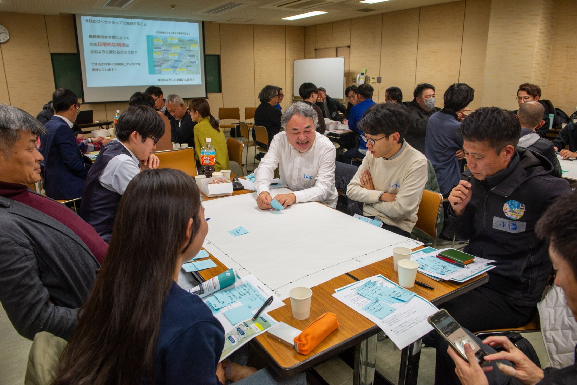 といった現実的なものから「川を使って通勤する」「川辺の中州でテントを張る」というような驚くような意見も出されました。また、予測ができるのであれば、「鮎や鳥の観察会」や「洪水前に川のゴミを拾う」「水位を観察する」といった洪水の前後に楽しむ企画もできるのではないかと、これまでには考えられなかった川という環境を使った活動のアイデアも。仕事の時の雰囲気とは少し違い、わきあいあいとそれぞれの立場で乙川でやりたいことはもちろん、一市民としてのアイデアや楽しみ方が出てきて、終始和やかな雰囲気で進みました。