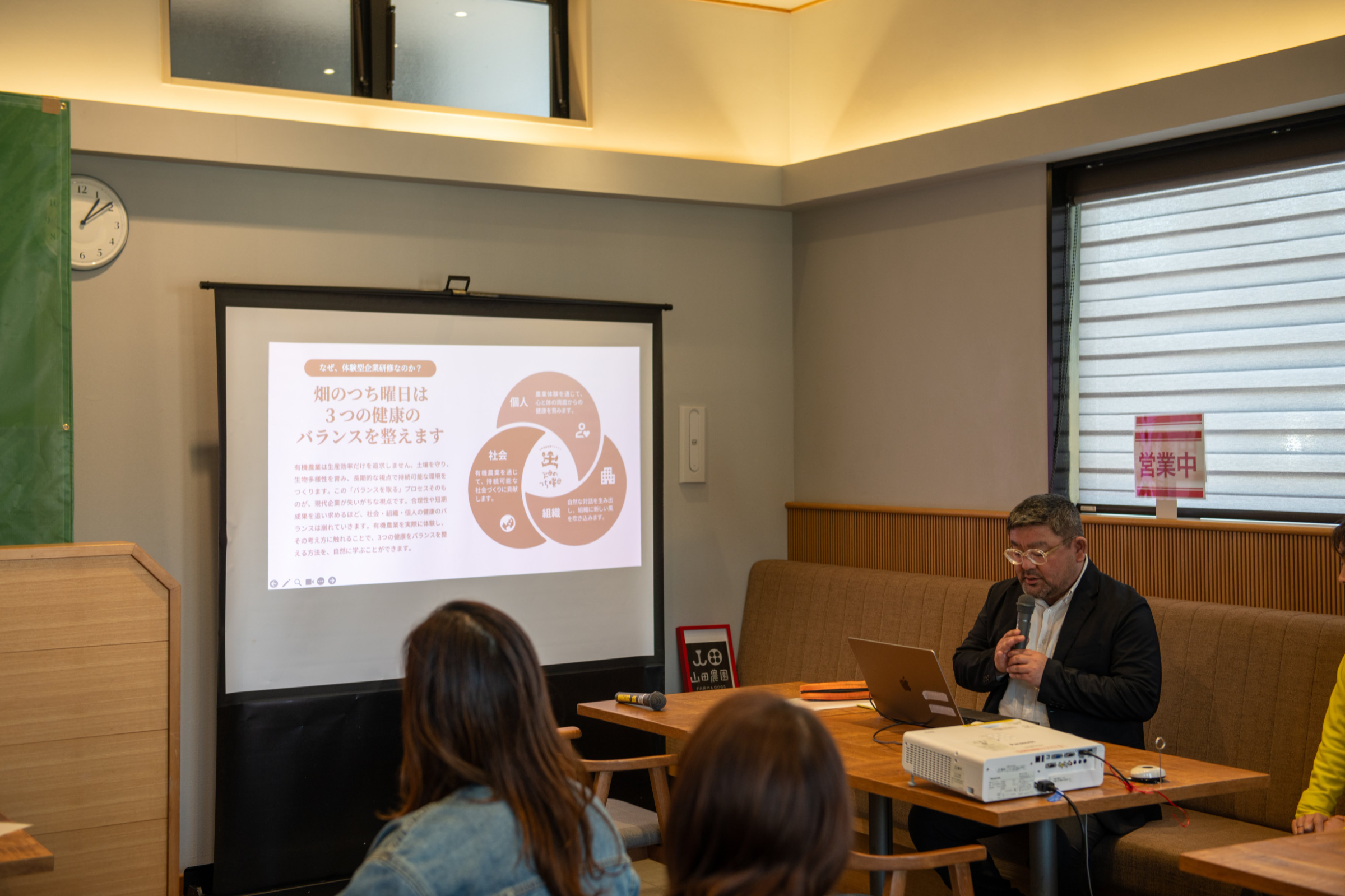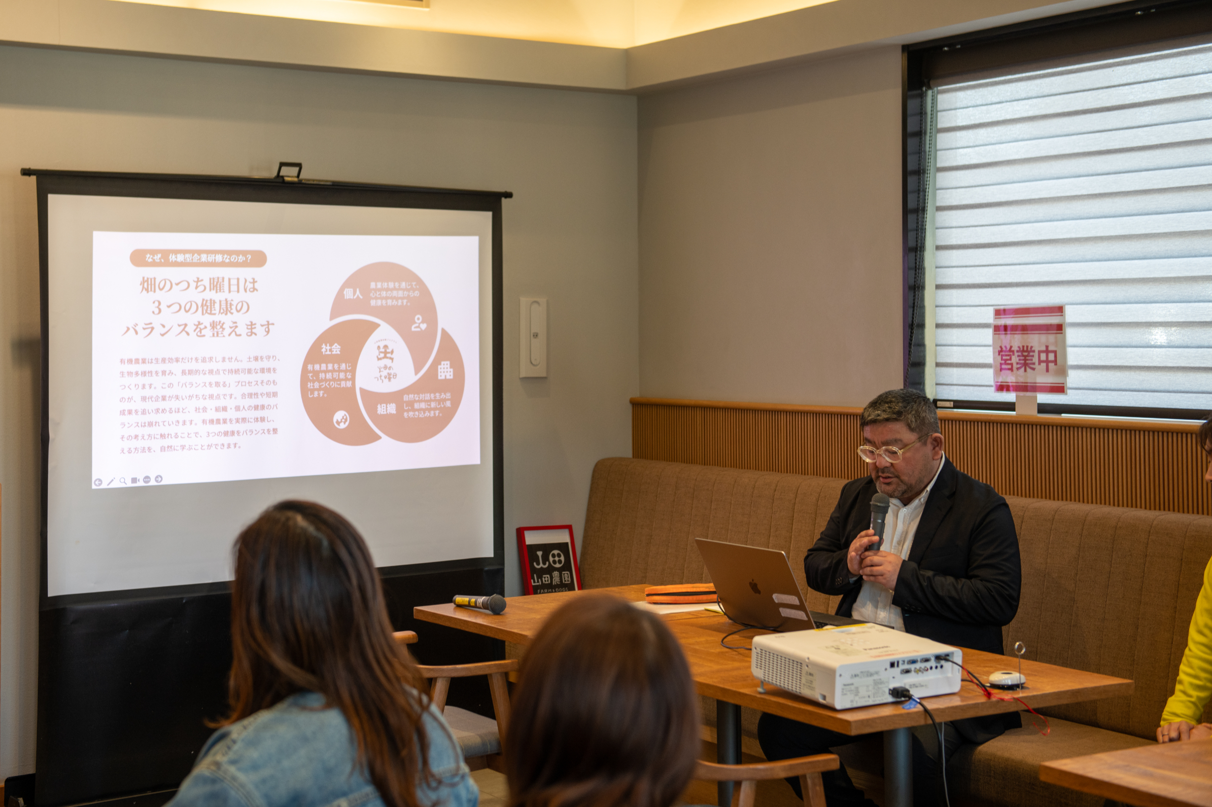 続いて、ONE RIVERの山田より、畑のつち曜日の企画概要や具体的なプログラム内容の説明がスライドを用いて行われました。