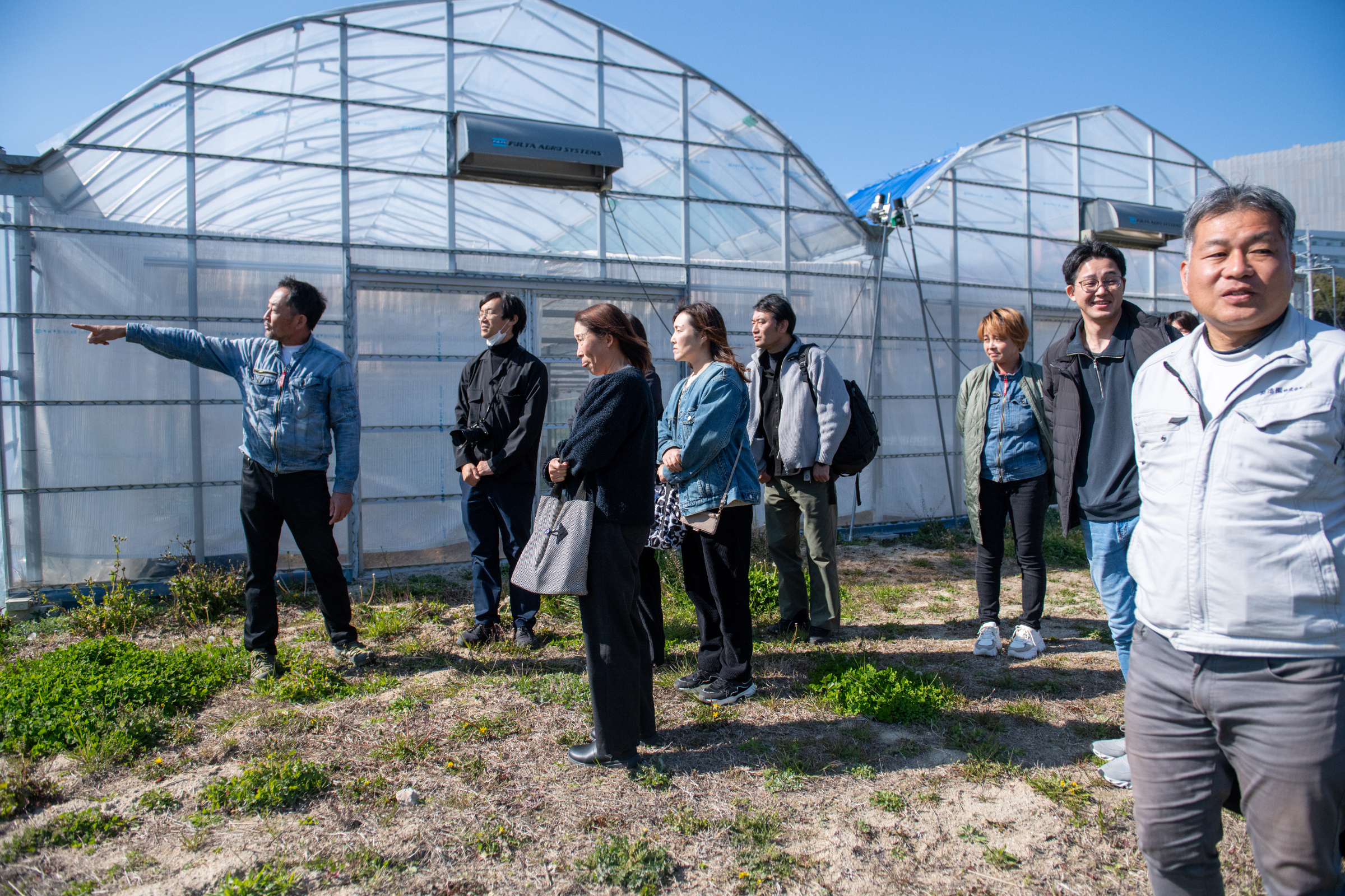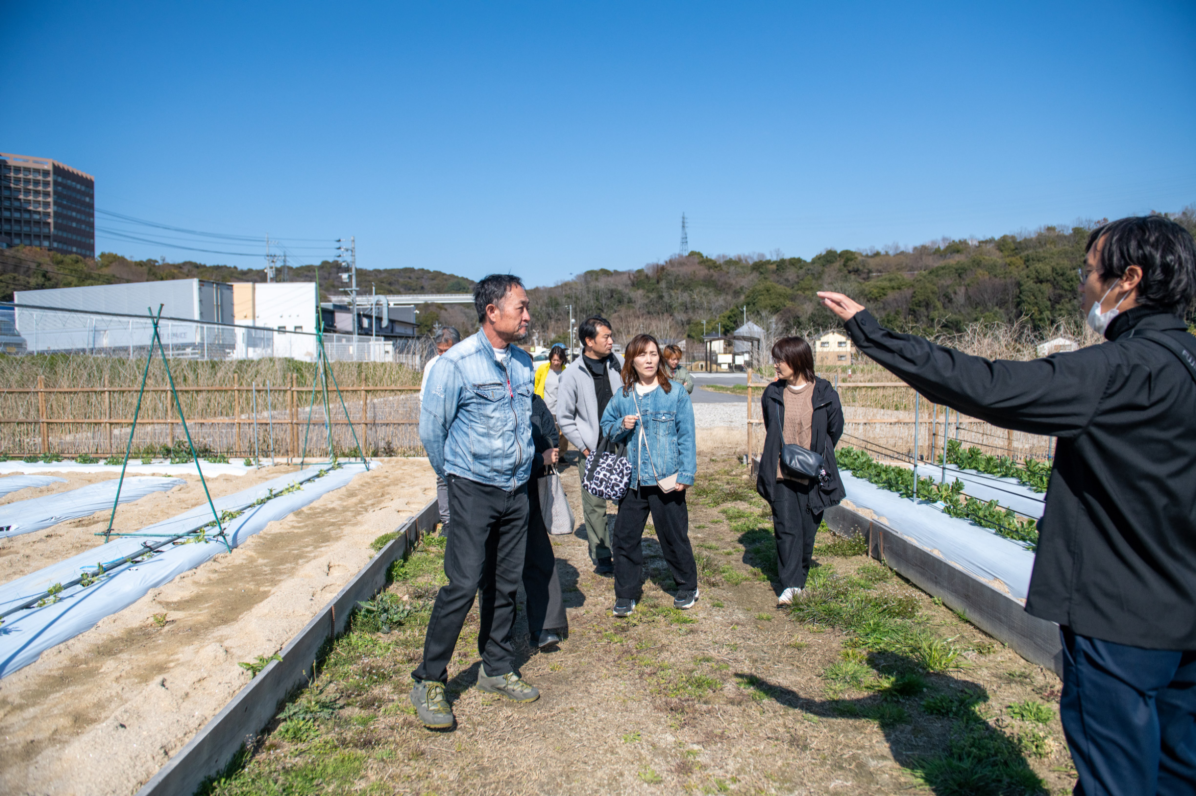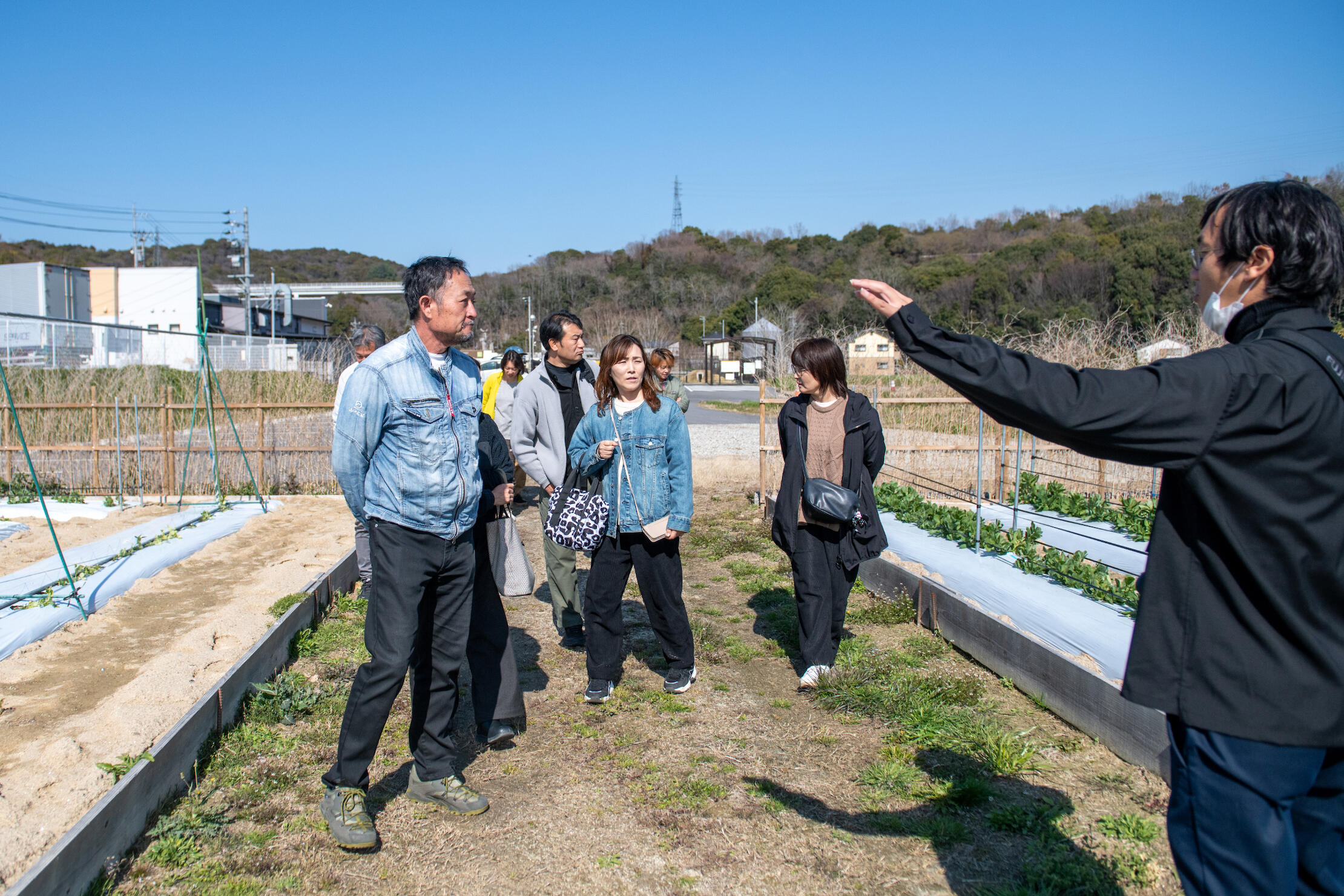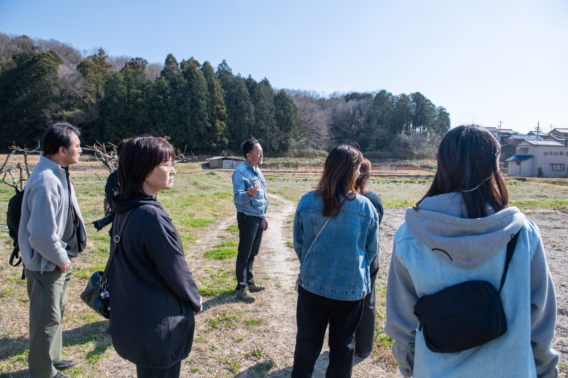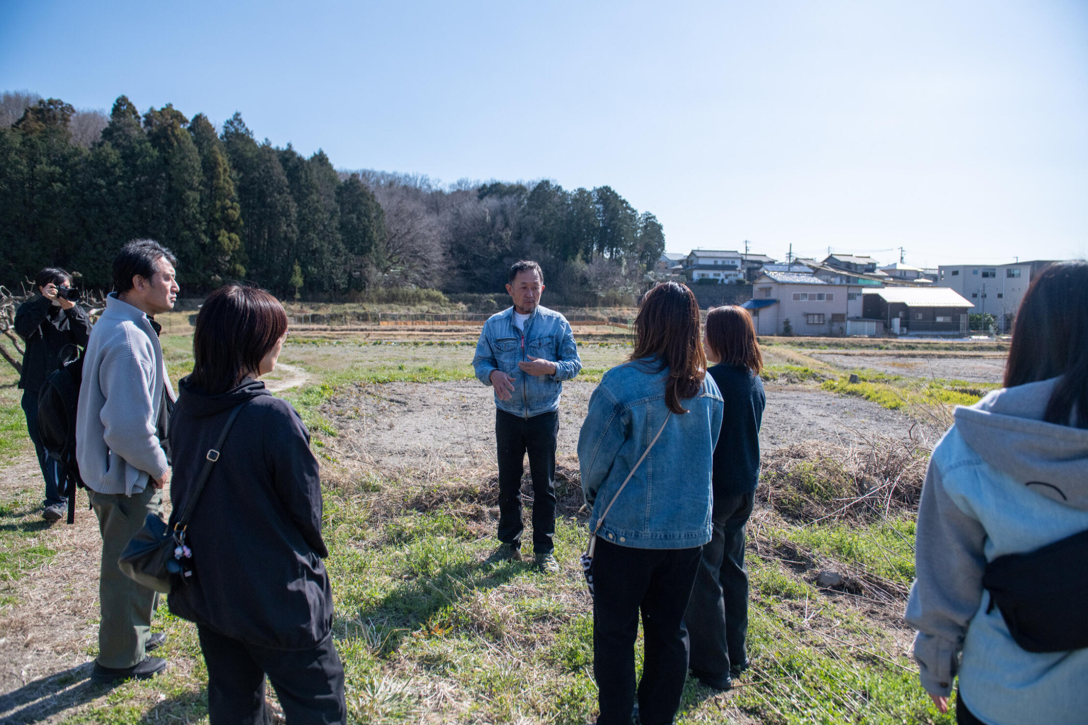 説明会の最後は、体験会のメインフィールドになる山田農園さんの畑を参加者みんなで見学しました。春の陽気に包まれながら、和やかな雰囲気で現場の案内が進みます。