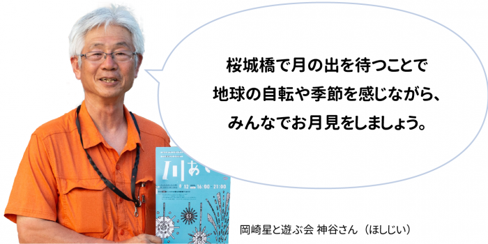 毎月一度、桜城橋に集まって、月の出を待つという「月待会(つきまちかい)」を実施しています。地球の自転を感じ、人間が本来持っている自然のサイクルを取り戻しリフレッシュしましょう!